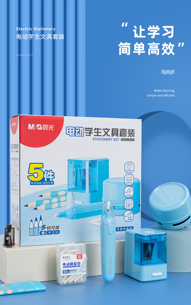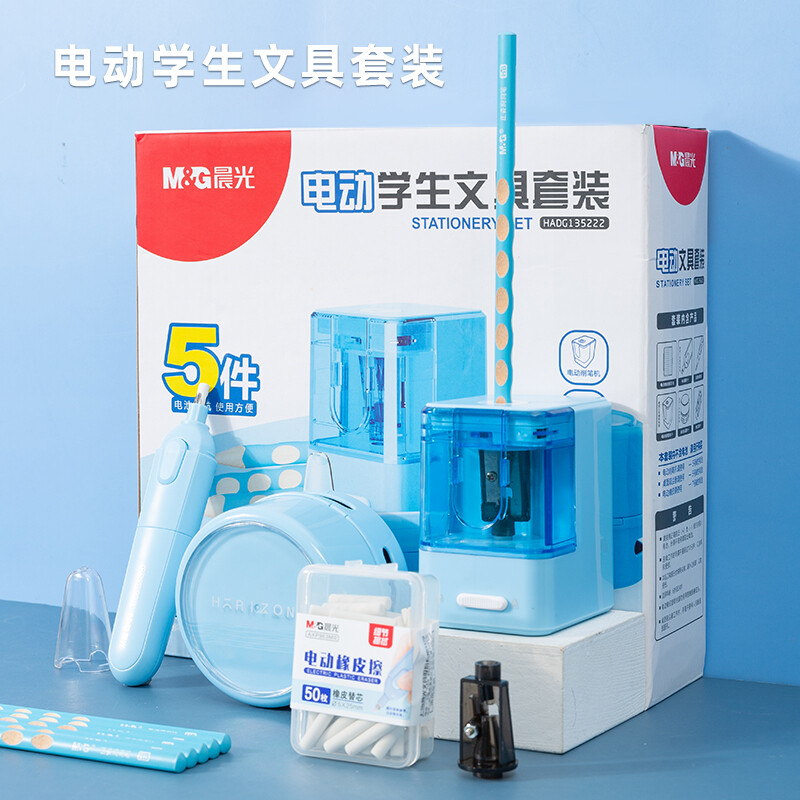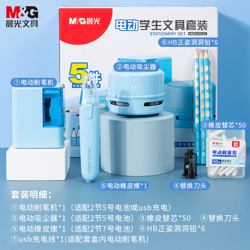 > 晨光(M&G)文具电动文具套装/开学文具/生日礼物 桌面吸尘器+电动橡皮+电动削笔机 5件套蓝色HADG1352B