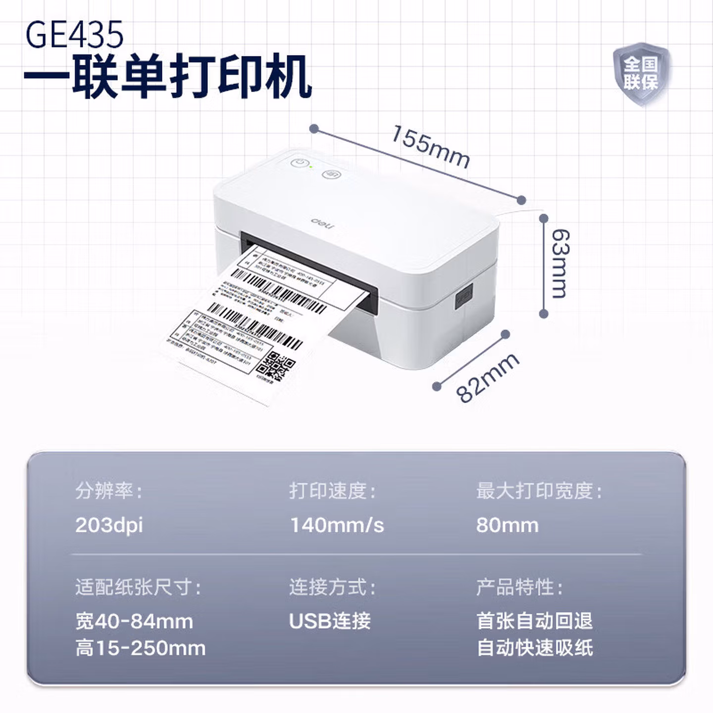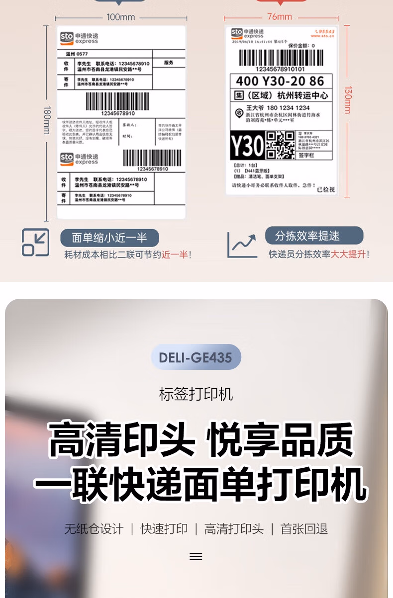 得力(deli)热敏不干胶打印机 快递仓储物流面单 超市食品服装价格标签打印机 商用办公二维码条码打印机 【GE435】一联单_电脑版+面单盒