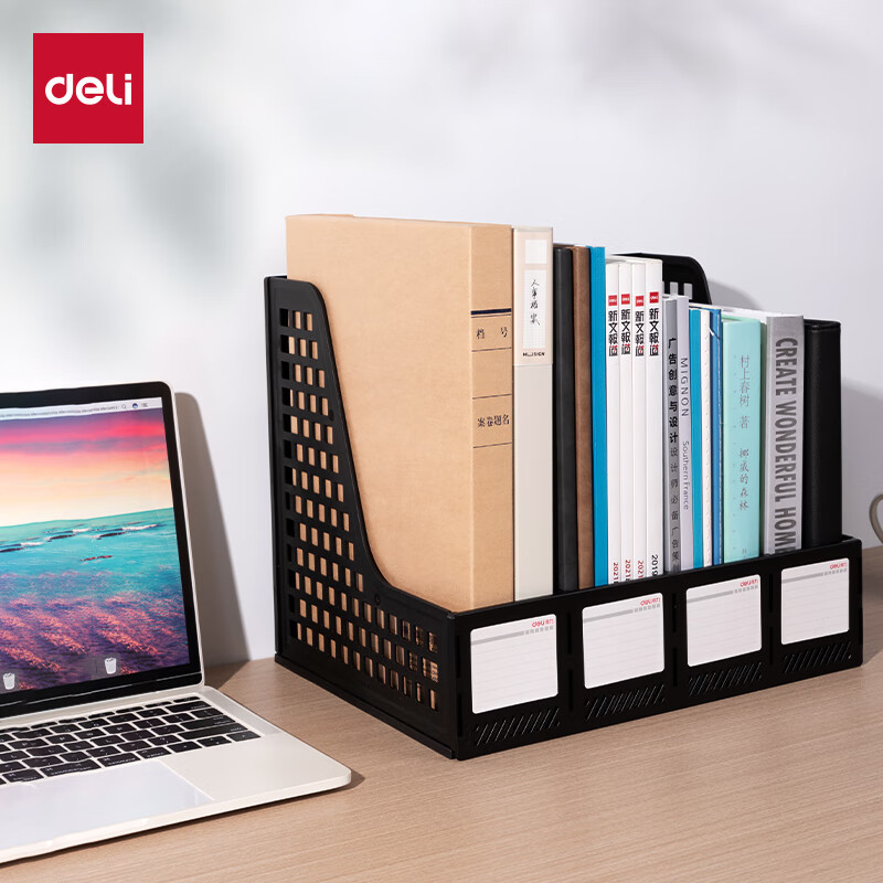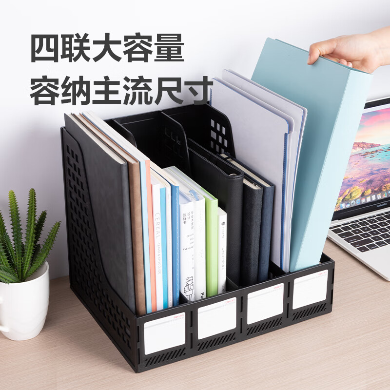 得力(deli)4联桌面文件框栏书立架档案收纳盒办公用品资料置物架书本收纳神器黑色