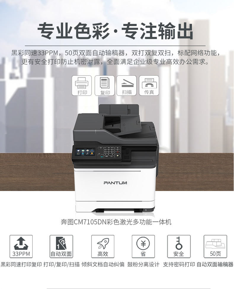 > 奔图 CM7105DN彩色激光多功能一体机 打印复印扫描传真 自动双面带网络 4.3英寸彩色触摸屏 奔图彩色激光一体机(四合一)CM7105DN