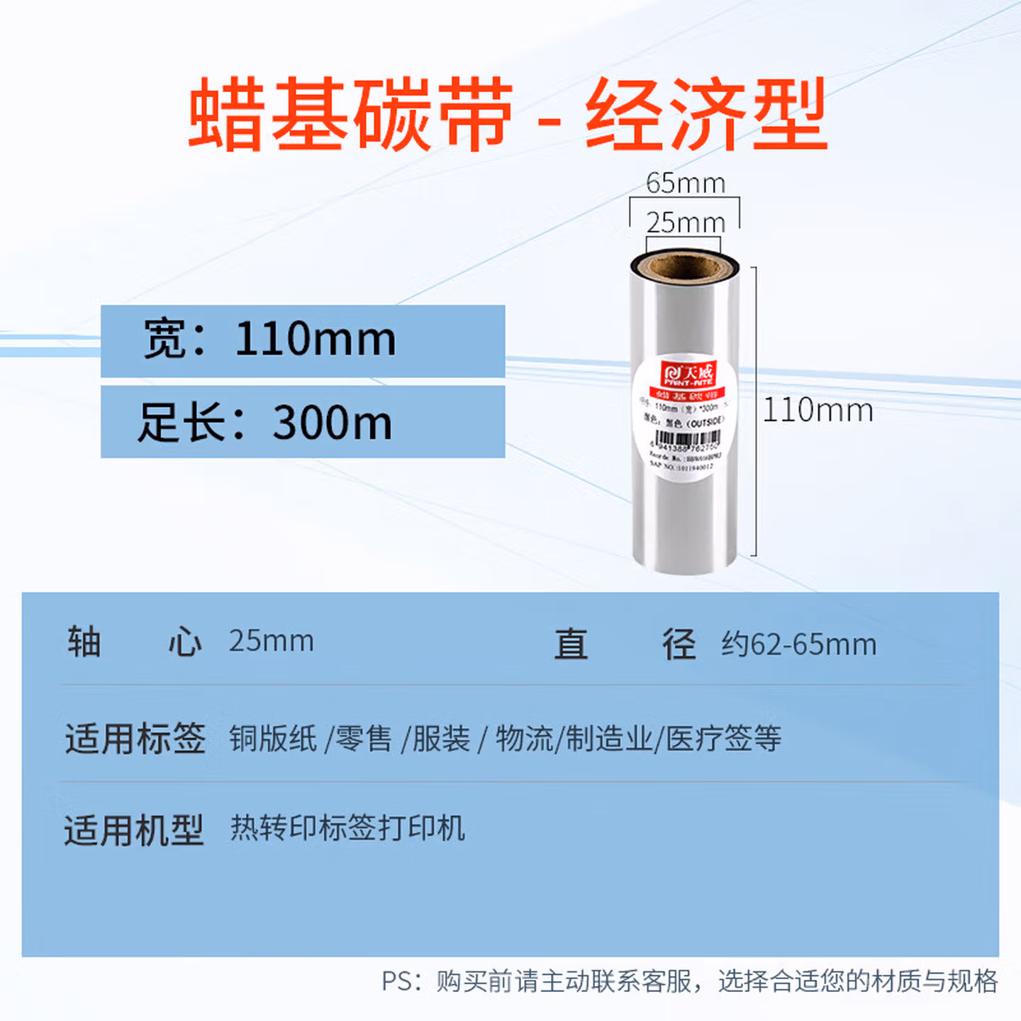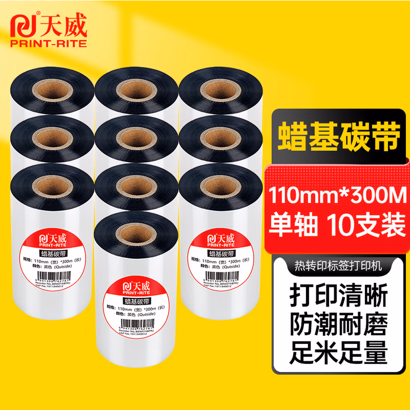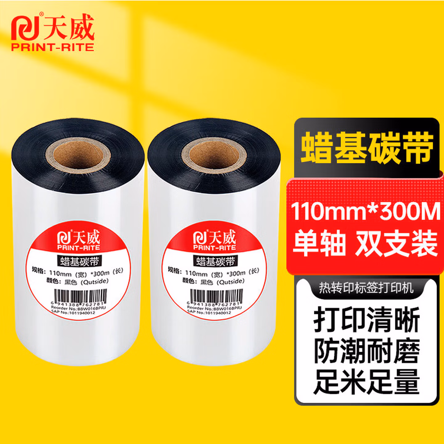 > 天威 蜡基碳带卷110mm*300m 双支装 条码机标签机热转印打印机色带