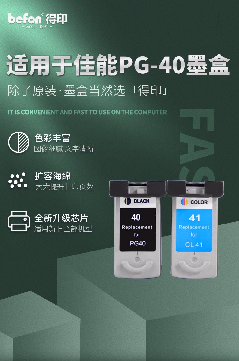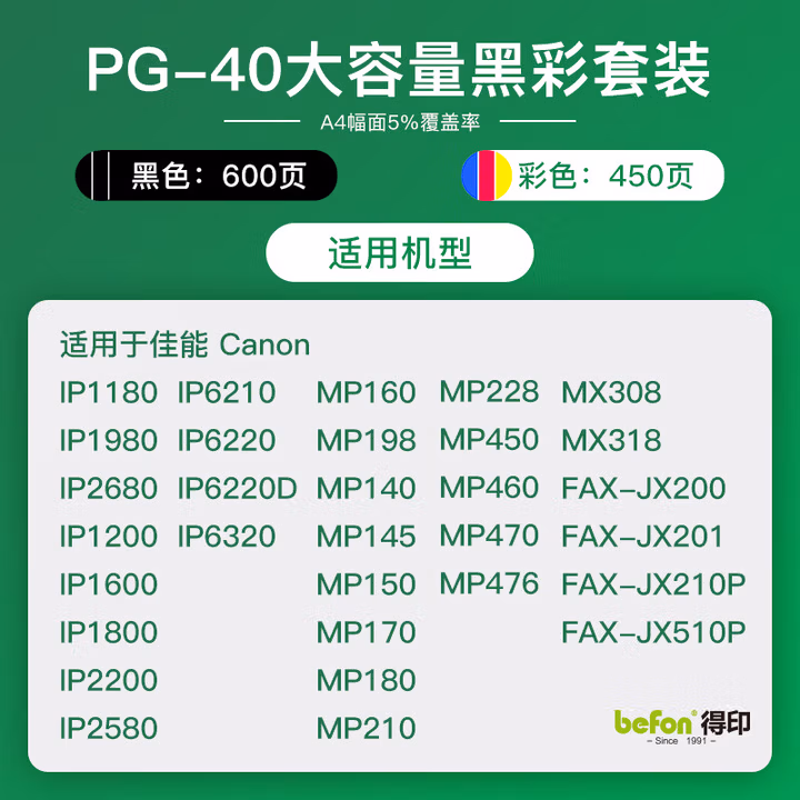 > 得印(befon)PG-40大容量黑色墨盒(适用佳能MP198/145/190/476 IP1980/1880/1180 IP1600/2580/1200/2680)