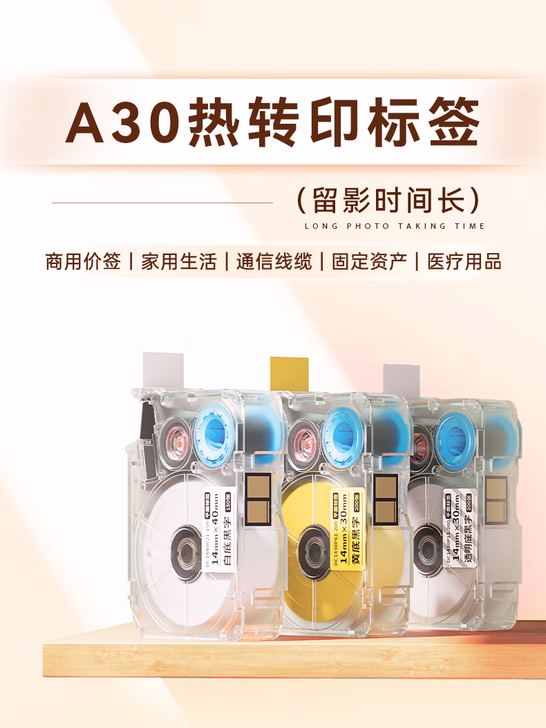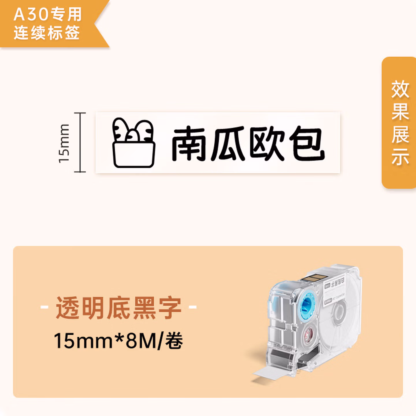 > 爱墨【连续标签/15mm透明底黑字8米】热转印 适用A30/P15PET防水不干胶家居收纳夜光开关贴纸线缆标签