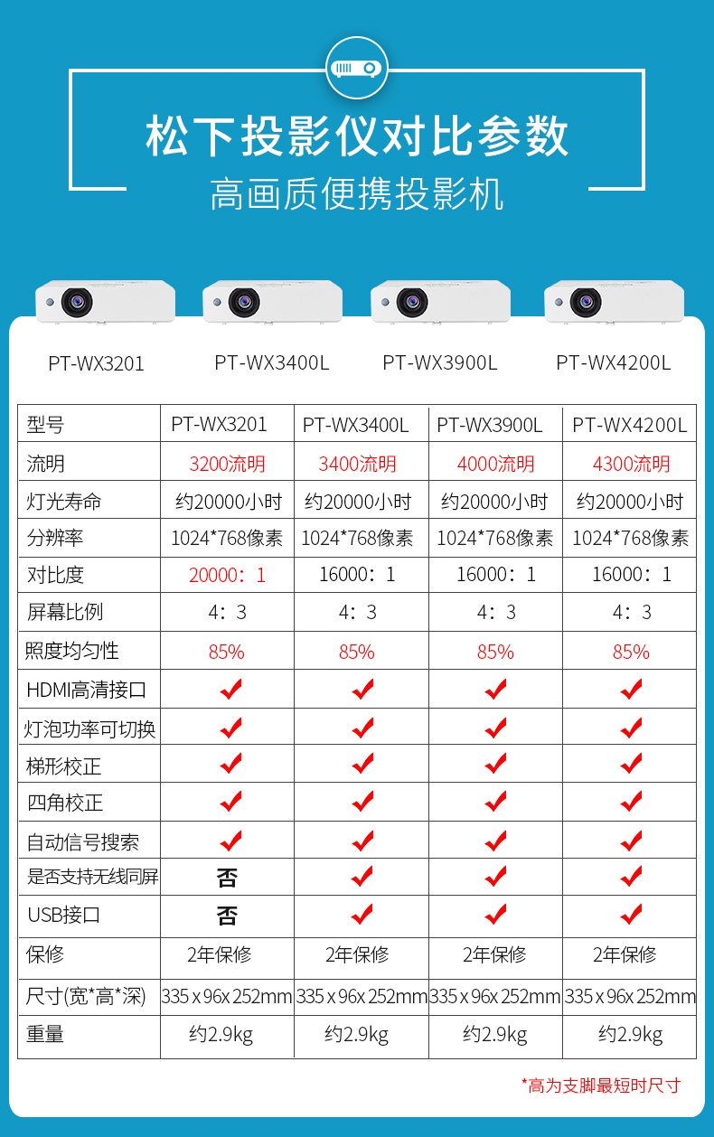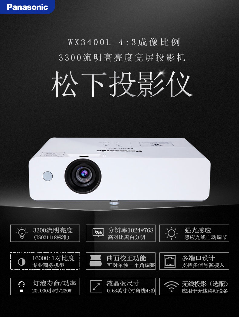 > 松下PT-WX3400L投影机无线WIFI家用办公商用高清宽屏会议家庭影院电影游戏娱乐KTV投影仪 激光翻页笔【JP】