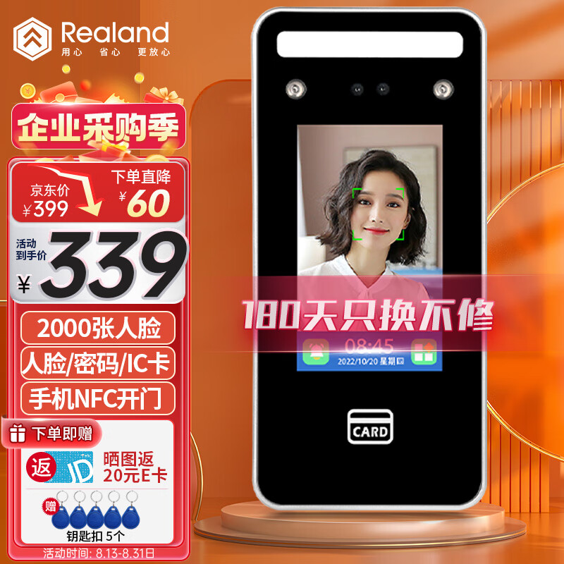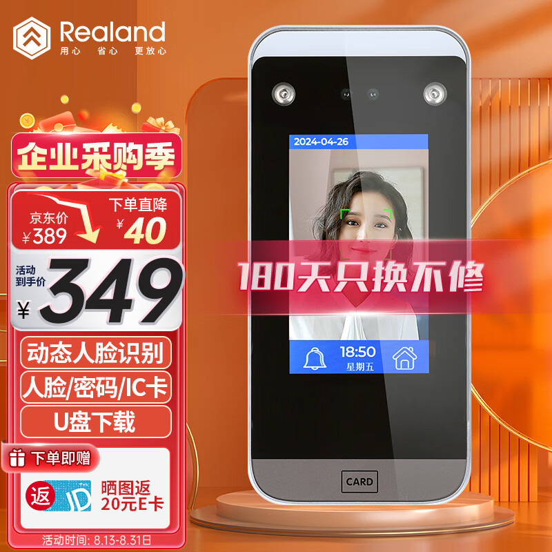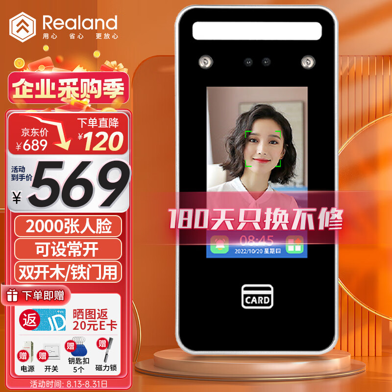 真地(Realand)人脸识别门禁一体机单门磁力锁套装办公室密码IC卡门禁系统刷脸开门含12V5a电源 F101A