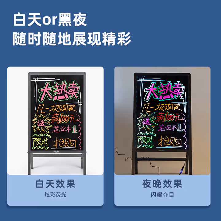 > 得力(deli)60*80cm夜市摆摊地摊神器荧光板 白板 支架电子荧光板 LED灯手写广告牌 发光黑板 白板MZ902_A