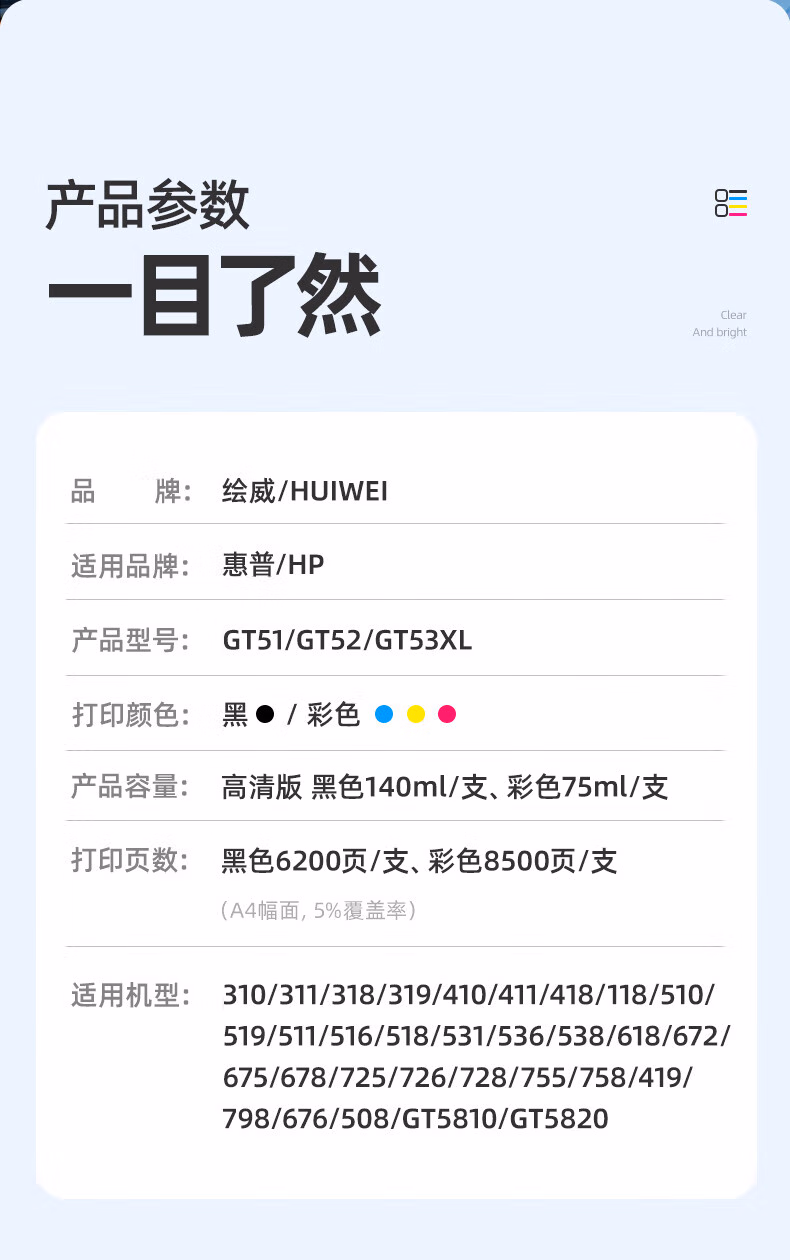 > 绘威适用惠普HP Tank518 519 678 510 538 418 516 511 411 530 531 536 582 588打印机墨盒墨水GT52/GT53XL 四色