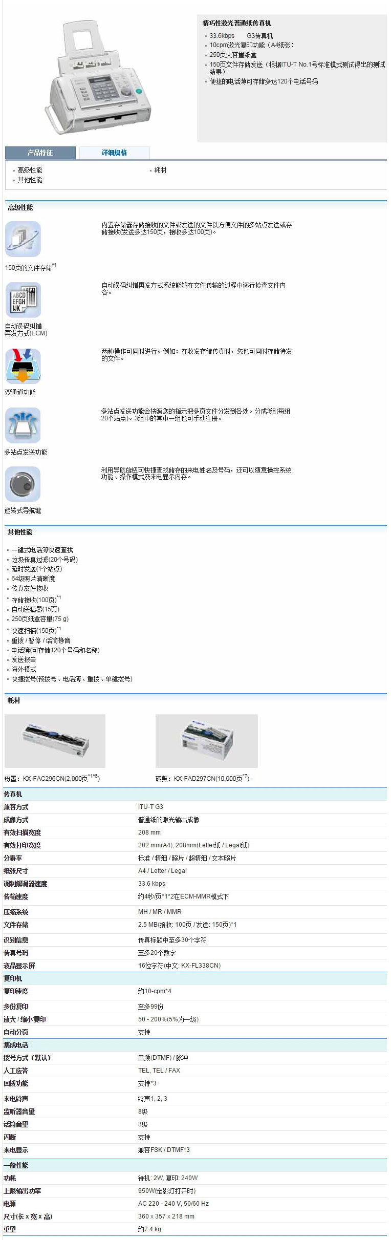 > 松下(Panasonic)KX-FL338CN /328CN激光传真机A4普通纸传真机中文 松下KX-FL328CN黑白随机