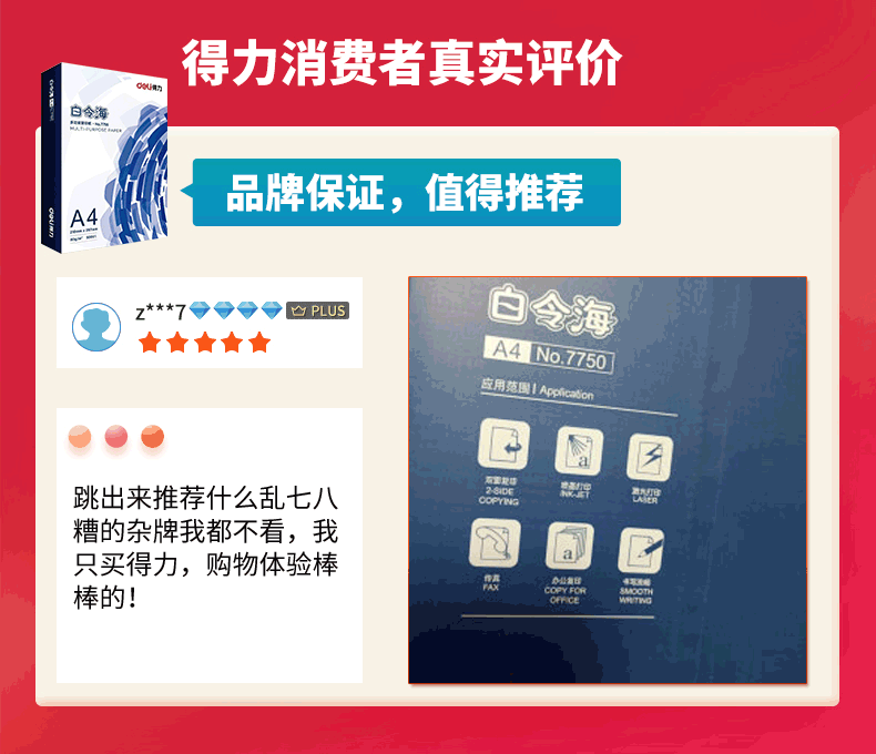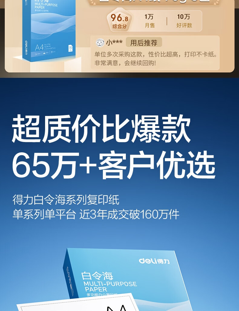> 得力(deli)白令海A4打印纸 70g500张*5包一箱 双面复印纸 入选纸类金榜 整箱2500张 7753【经济热销】