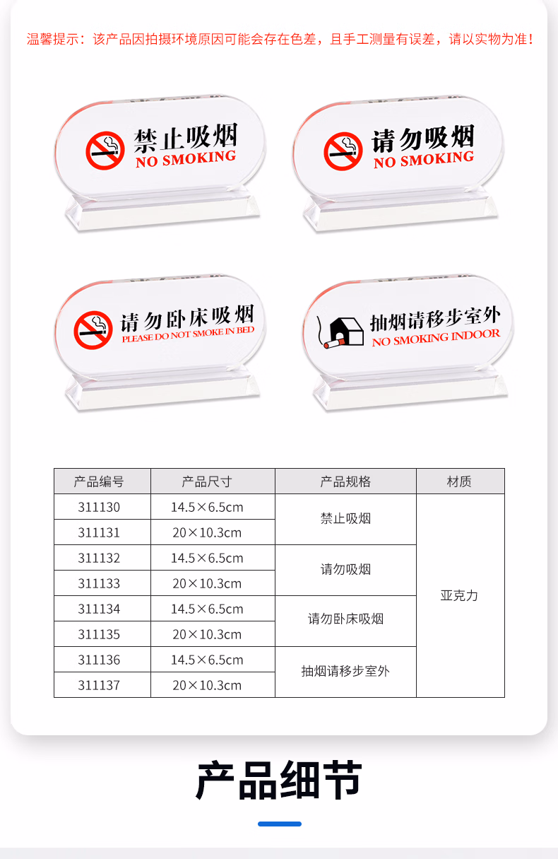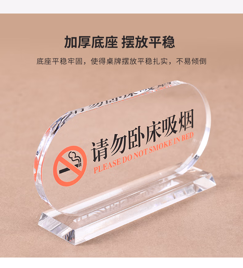> 安赛瑞 禁止吸烟禁烟桌牌 亚克力透明请勿卧床吸烟台卡 酒店指示牌14.5x6.5cm 311134