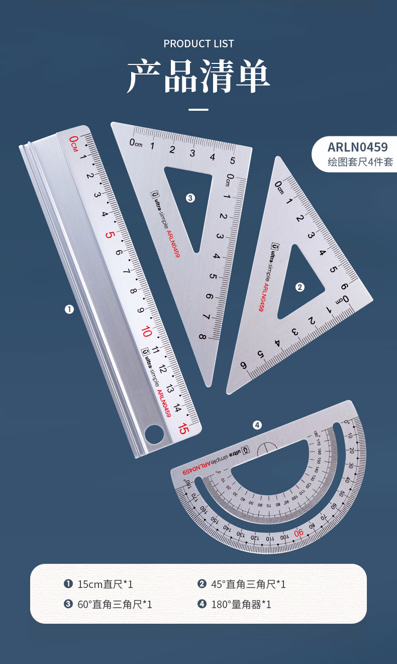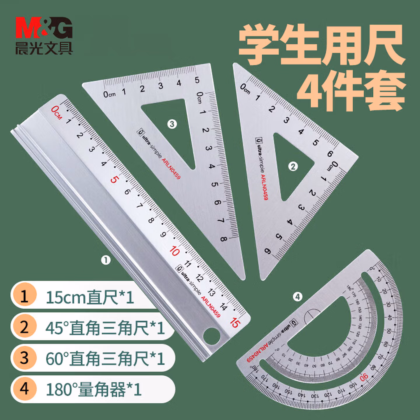 > 晨光(M&G)优品系列铝合金套尺学生绘图专业考试绘图(15cm直尺+三角尺*2+量角器)ARLN0459