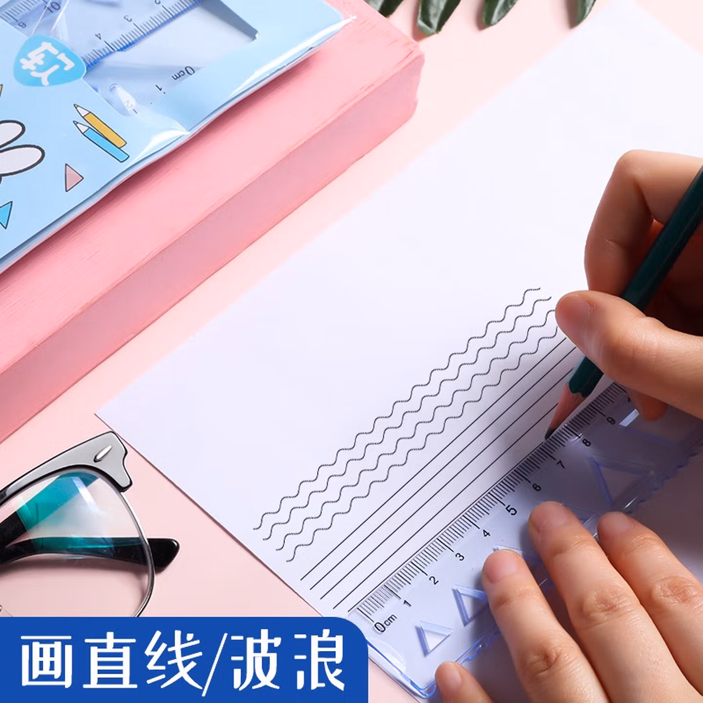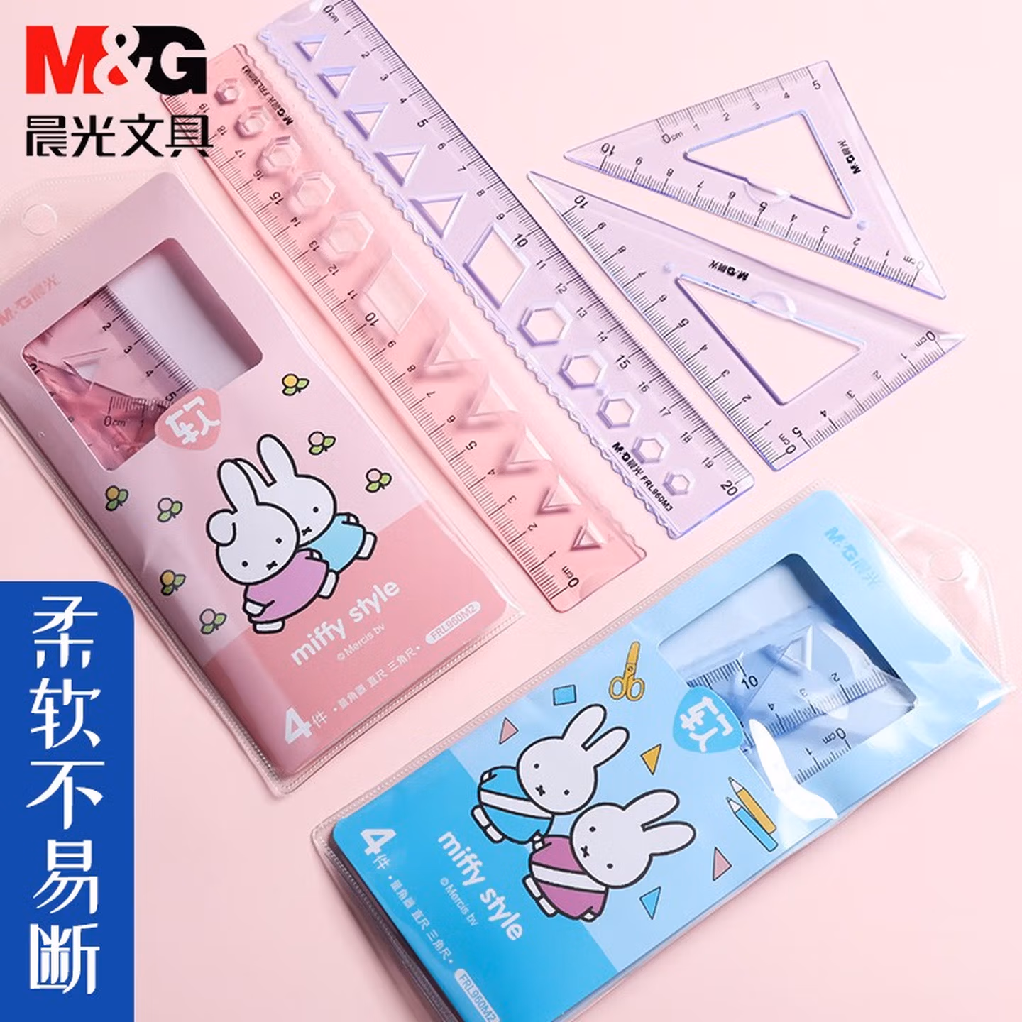 > 晨光软尺子学生文具软尺套装20cm软直尺带波浪线小学生一年级三角尺量角器多功能四件套儿童二年级套尺 20cm米菲粉套装(960M3)