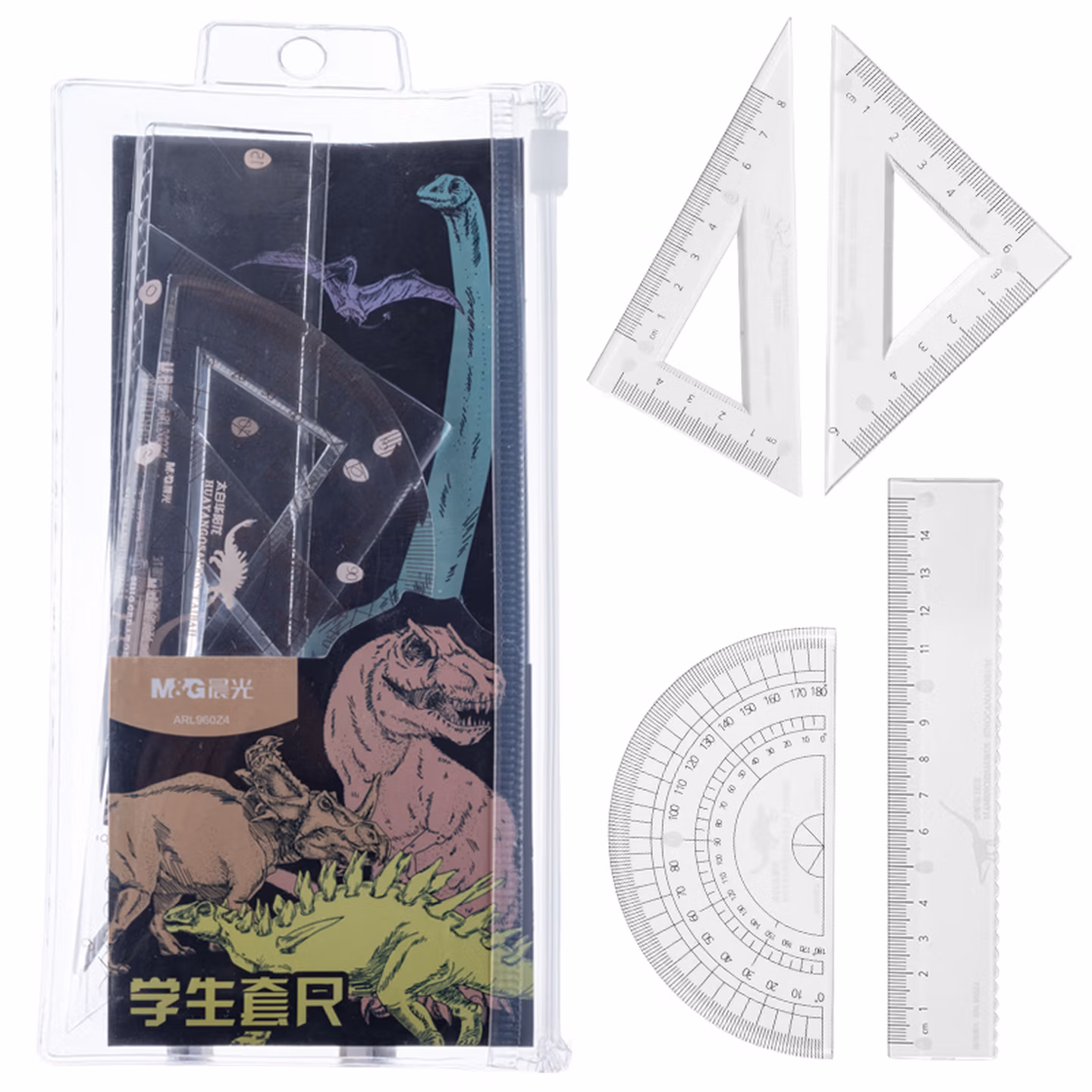 > 晨光(M&G)文具套尺 学生考试4件套(15cm直尺+量角器+三角尺*2)波浪尺子 中华恐龙系列ARL960Z4