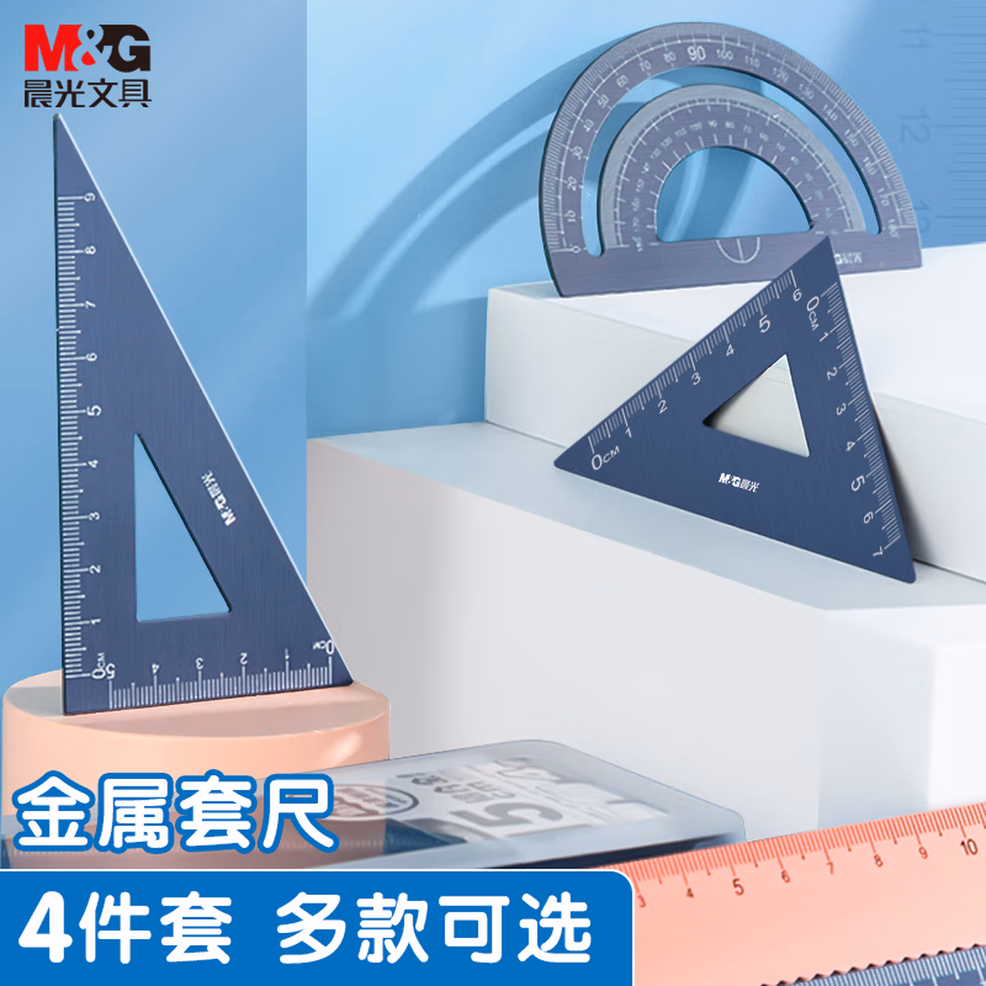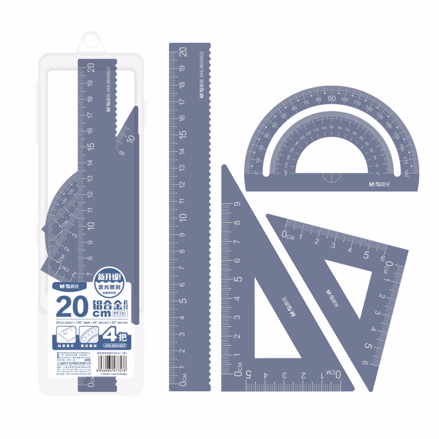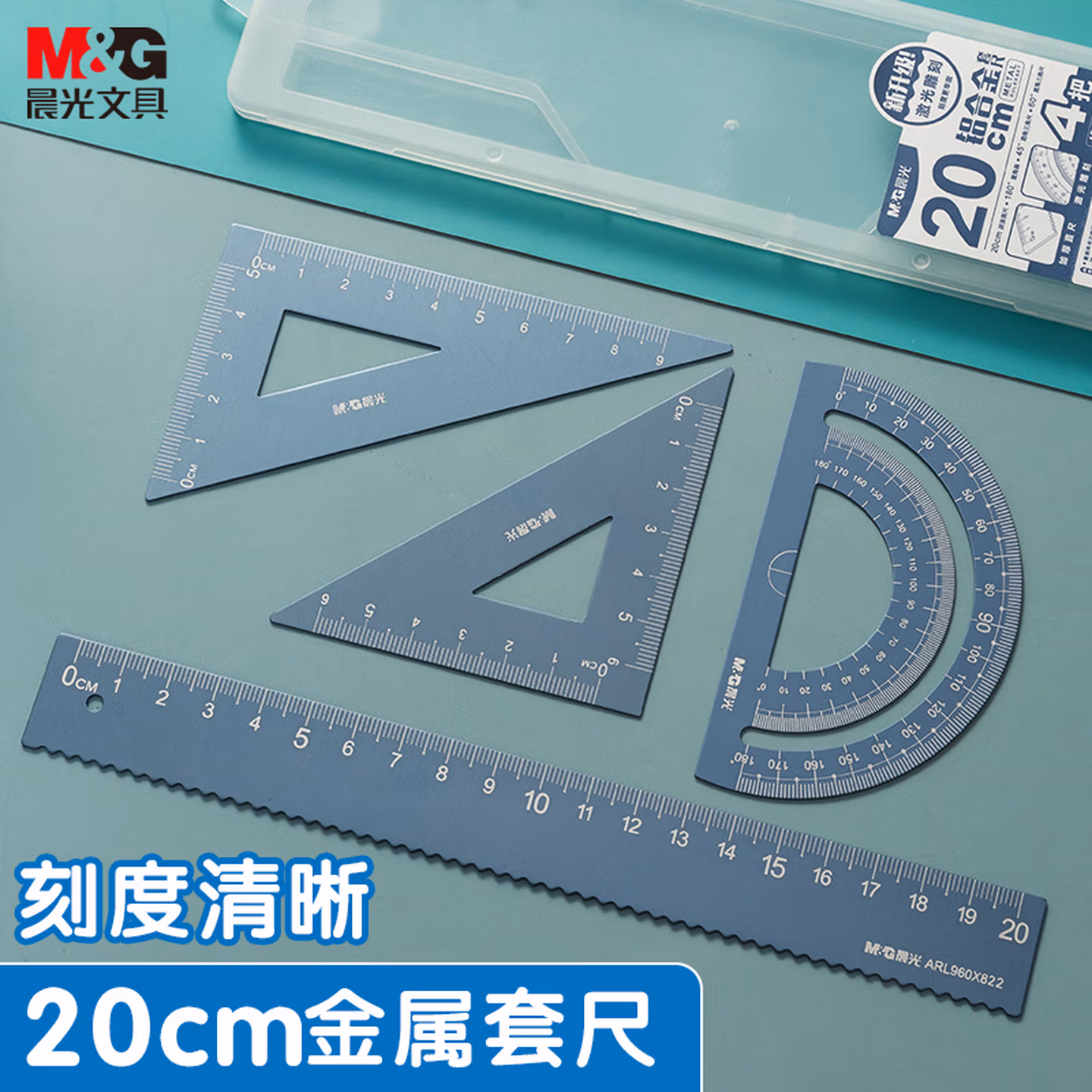 晨光(M&G)文具铝合金蓝套尺尺子套装小学生考试 4件套 直尺20cm+三角尺*2+量角器ARL960X822中考高考