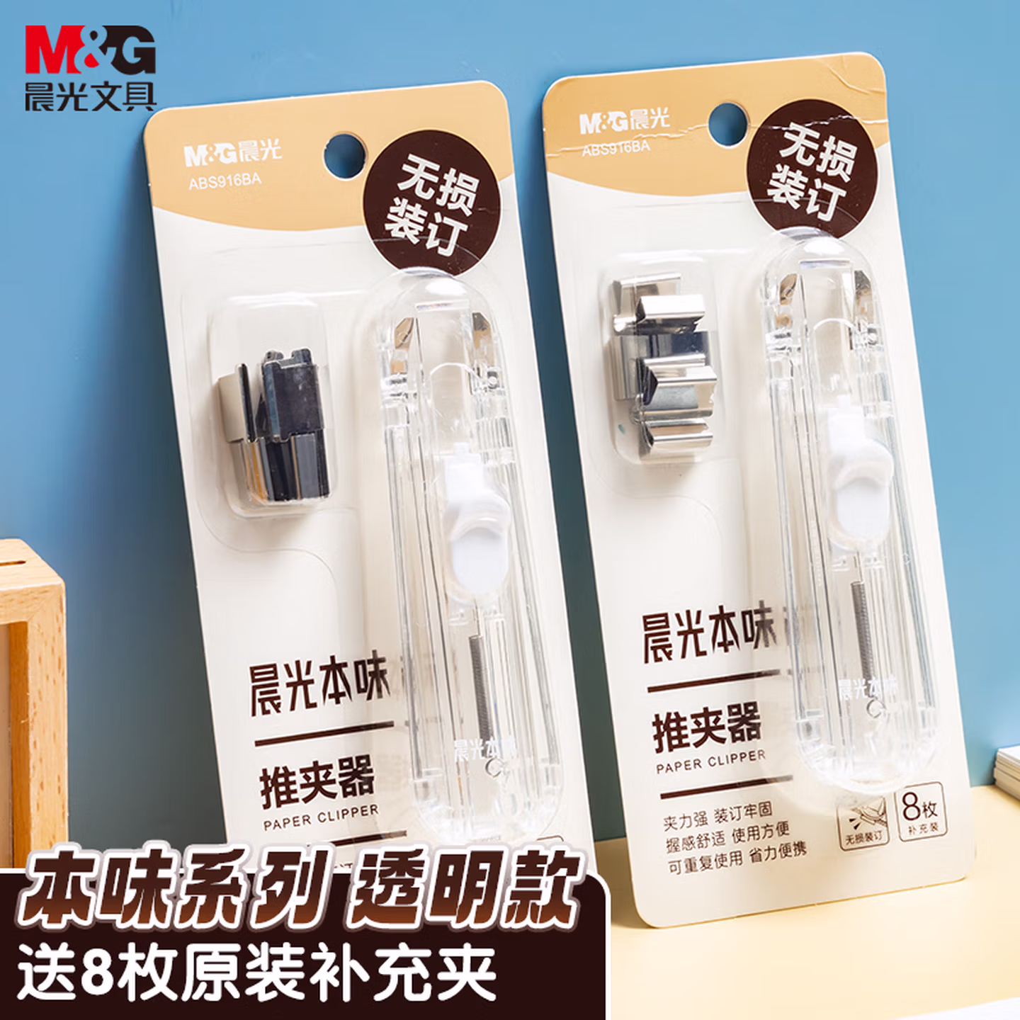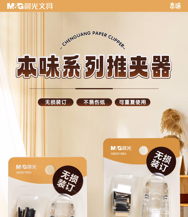 > 晨光(M&G)文具本味推夹器套装(推夹器*1+补充夹*8)办公便携无孔夹子 学生试卷无痕订书机 ABS916BA
