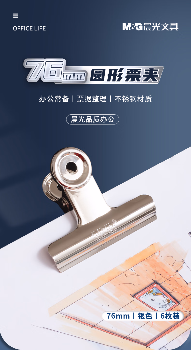 > 晨光(M&G)文具热门商品76mm银色圆形票夹 办公资料整理夹 财务票据夹 6个装ABS92645