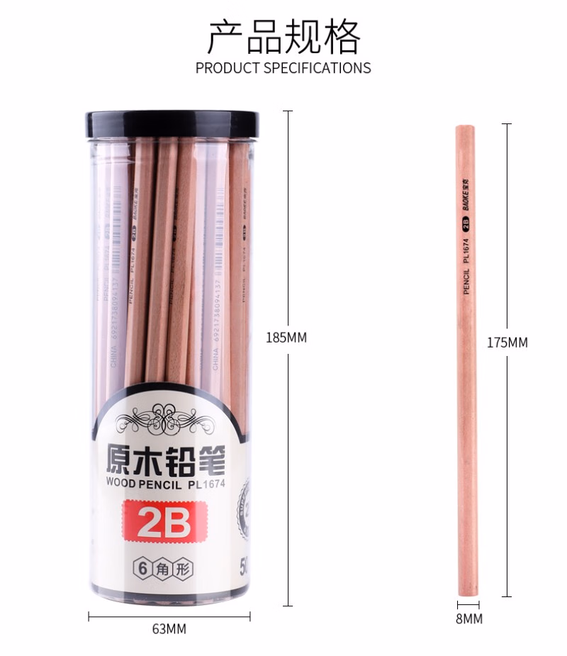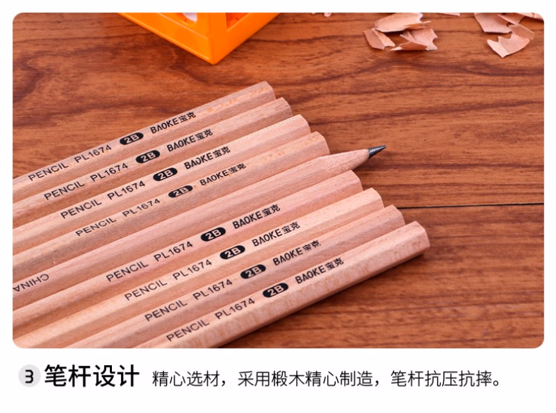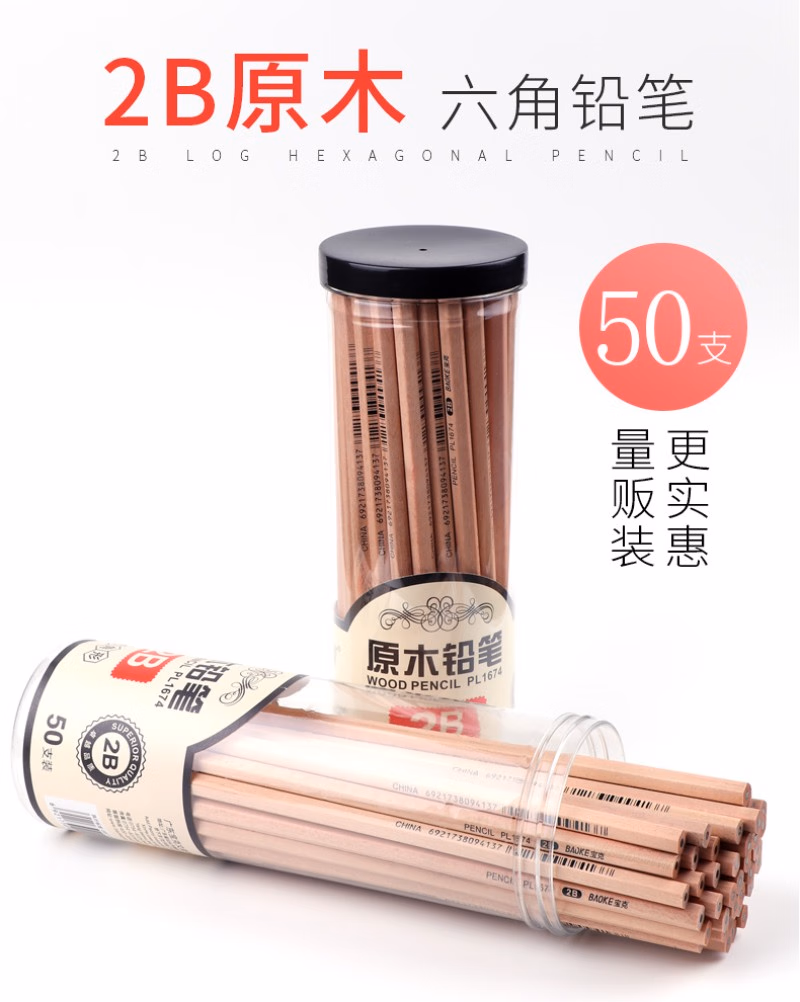 > 宝克(BAOKE)PL1674 原木六角笔杆2B铅笔绘图铅笔考试铅笔 50支/桶