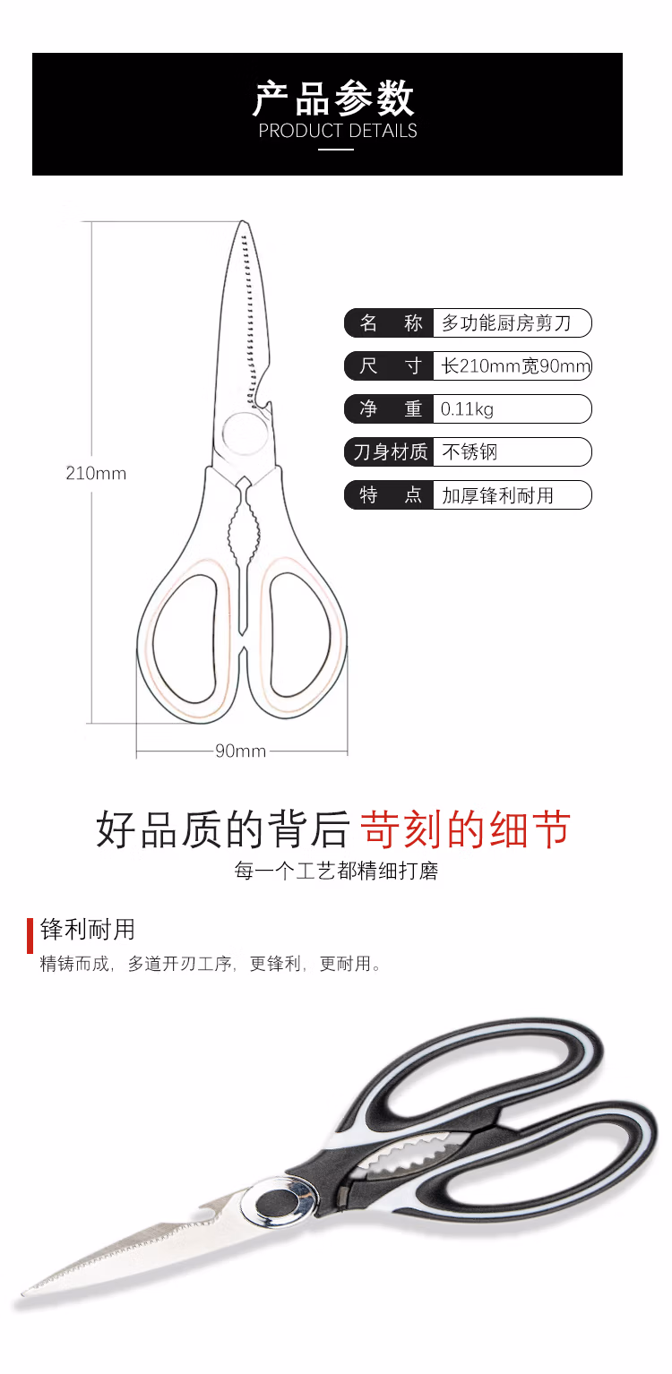 > 海斯迪克 不锈钢剪刀 开瓶厨房剪阳江剪刀黑白剪大蒜剪工业剪刀 鸡骨剪熊猫剪 黑白色 H-339