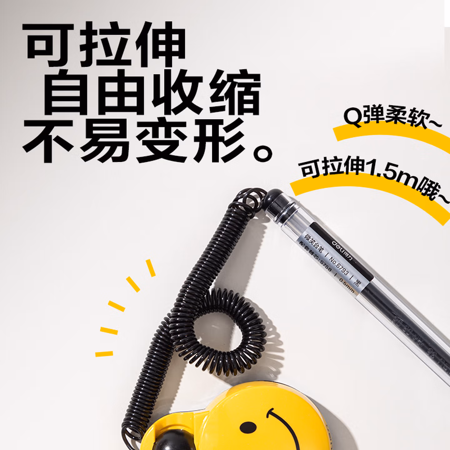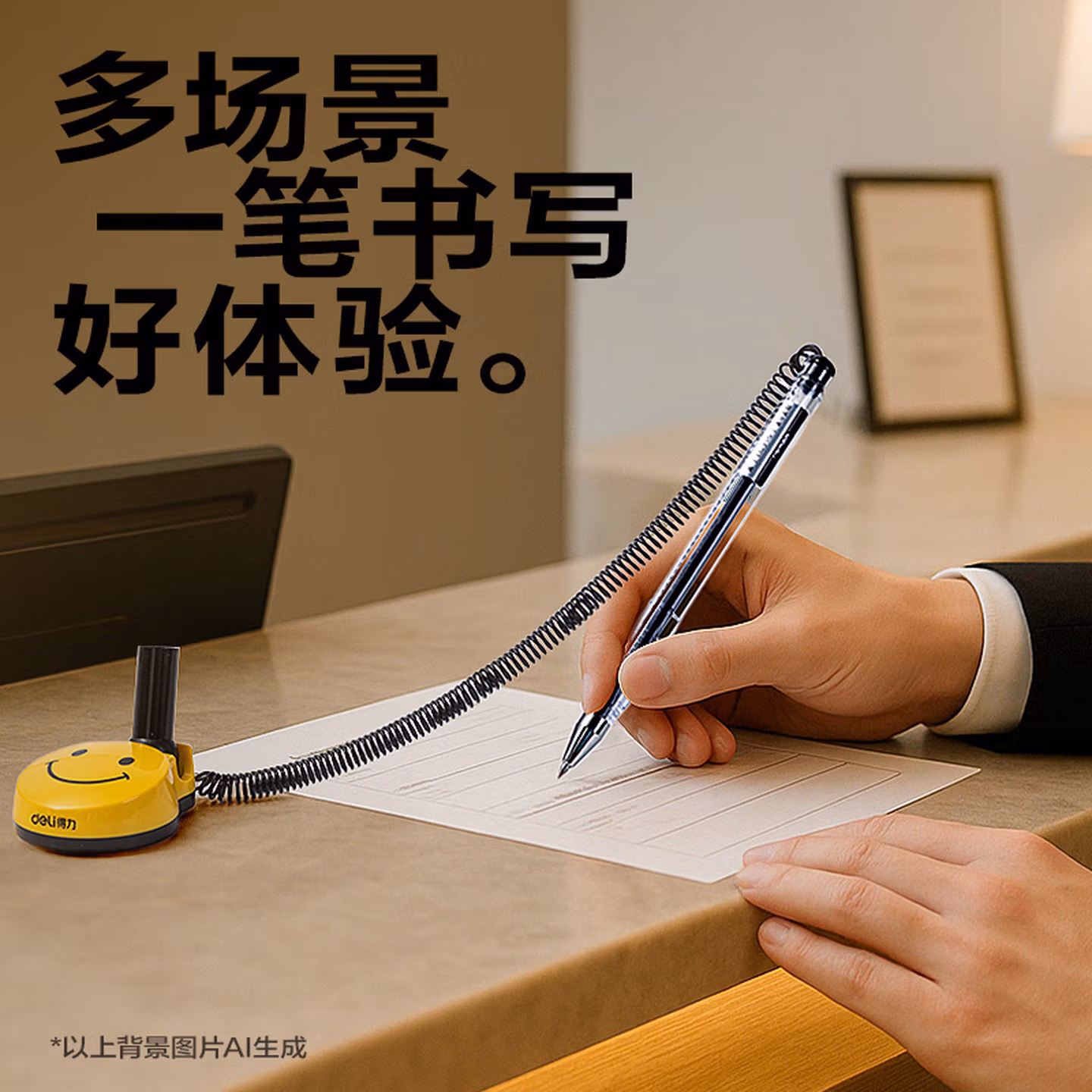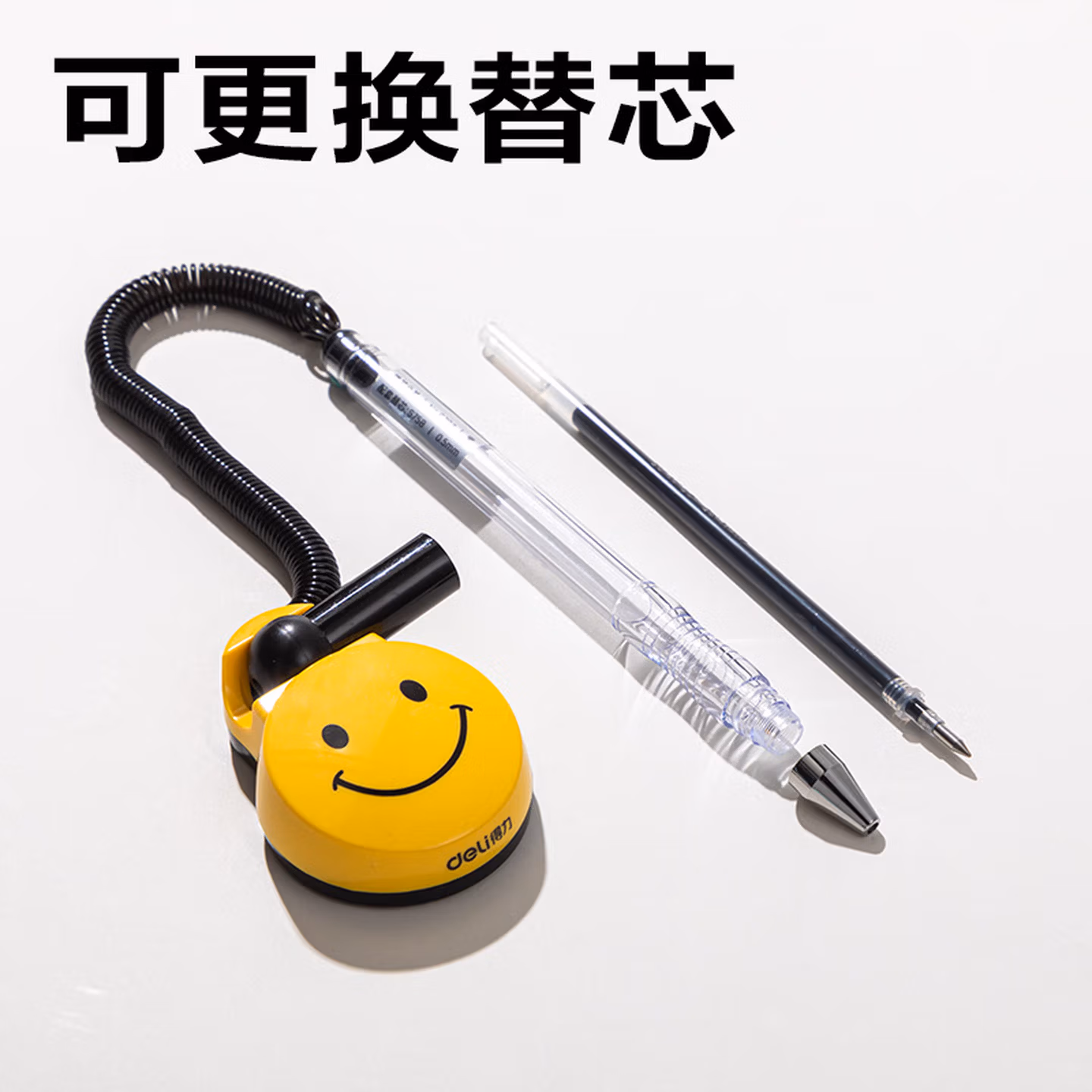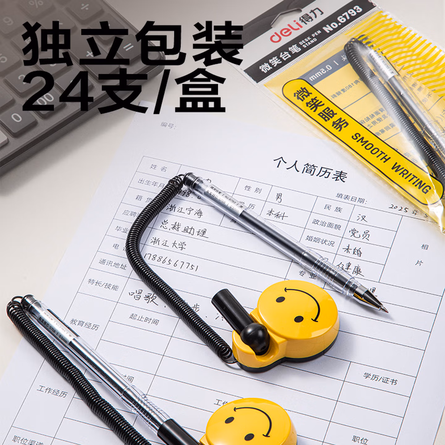 得力(deli)黑色微笑办公桌面台笔 0.5mm子弹头可粘贴台式中性笔24支/盒6793