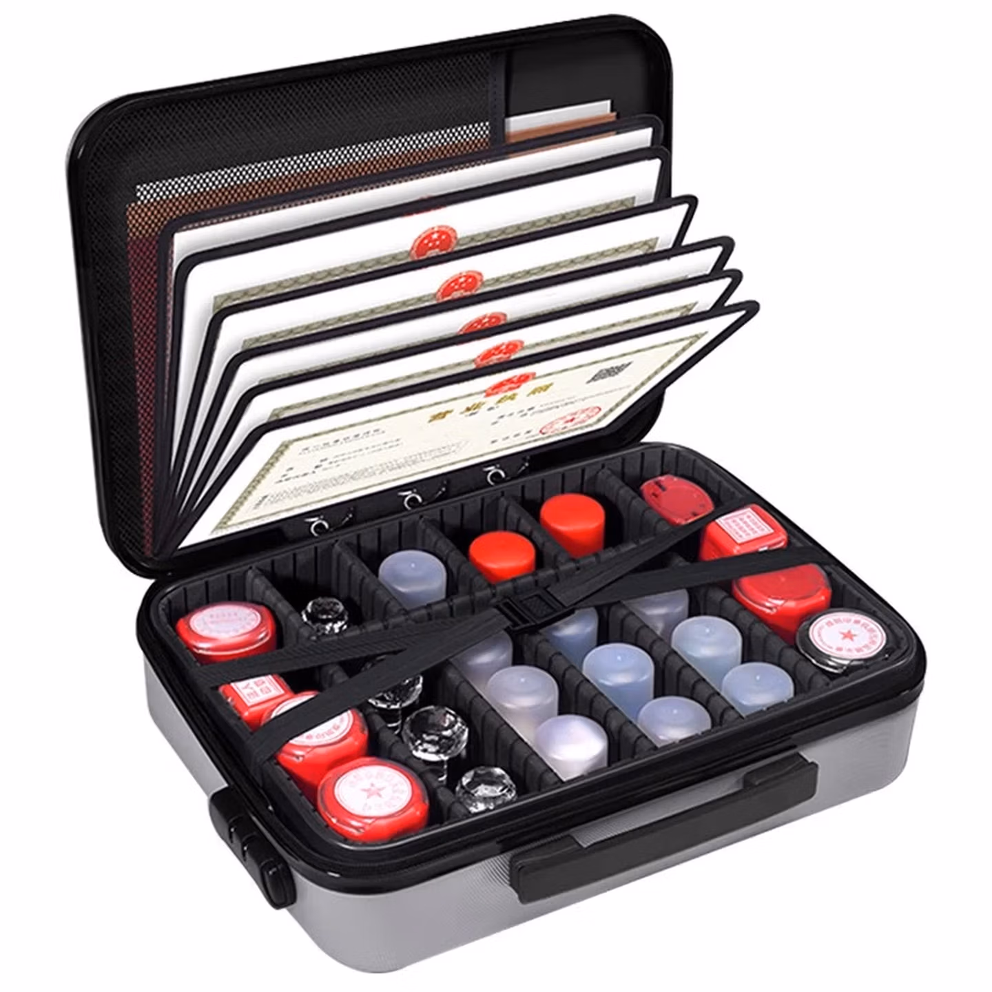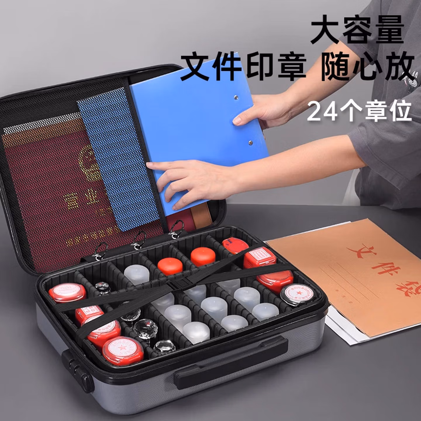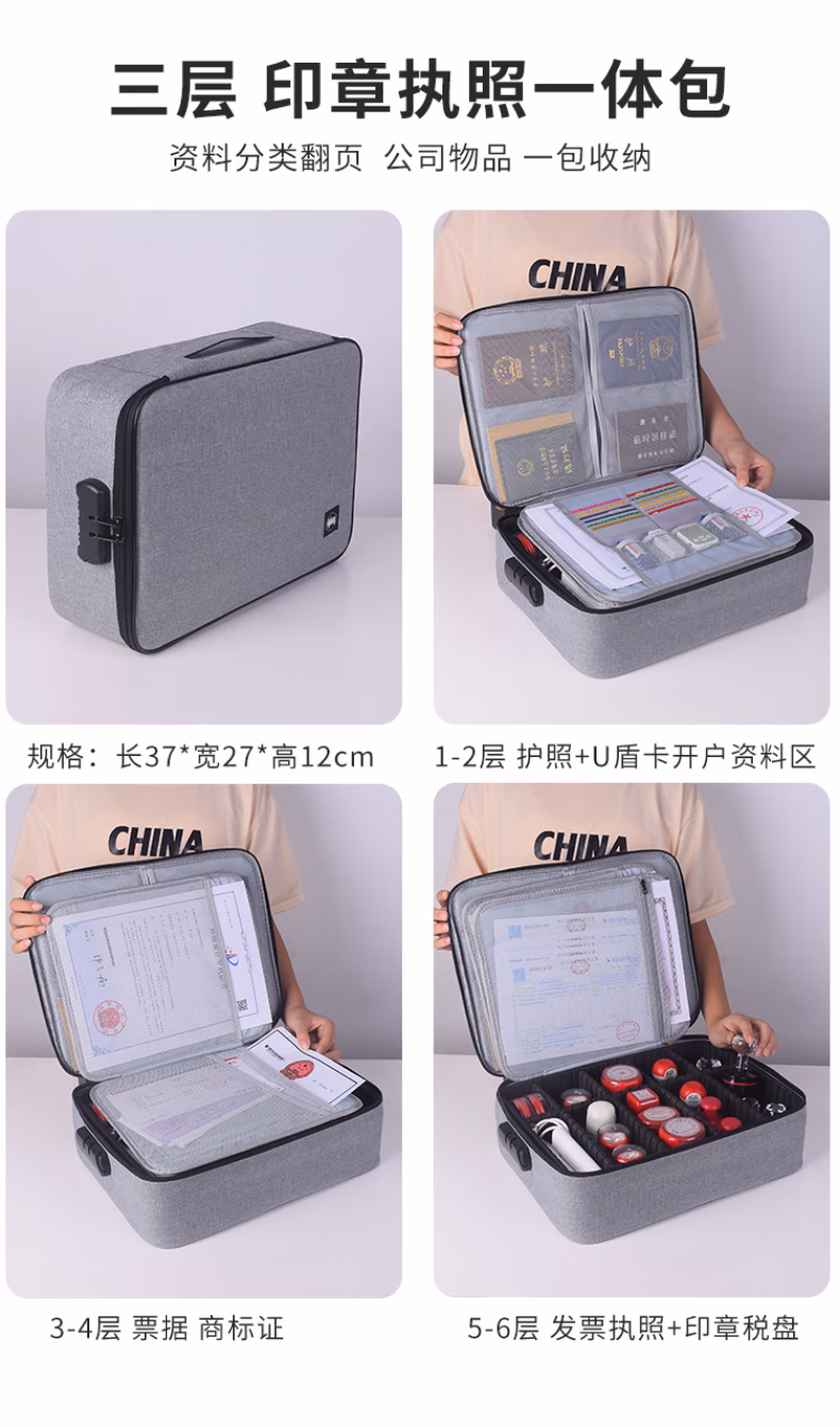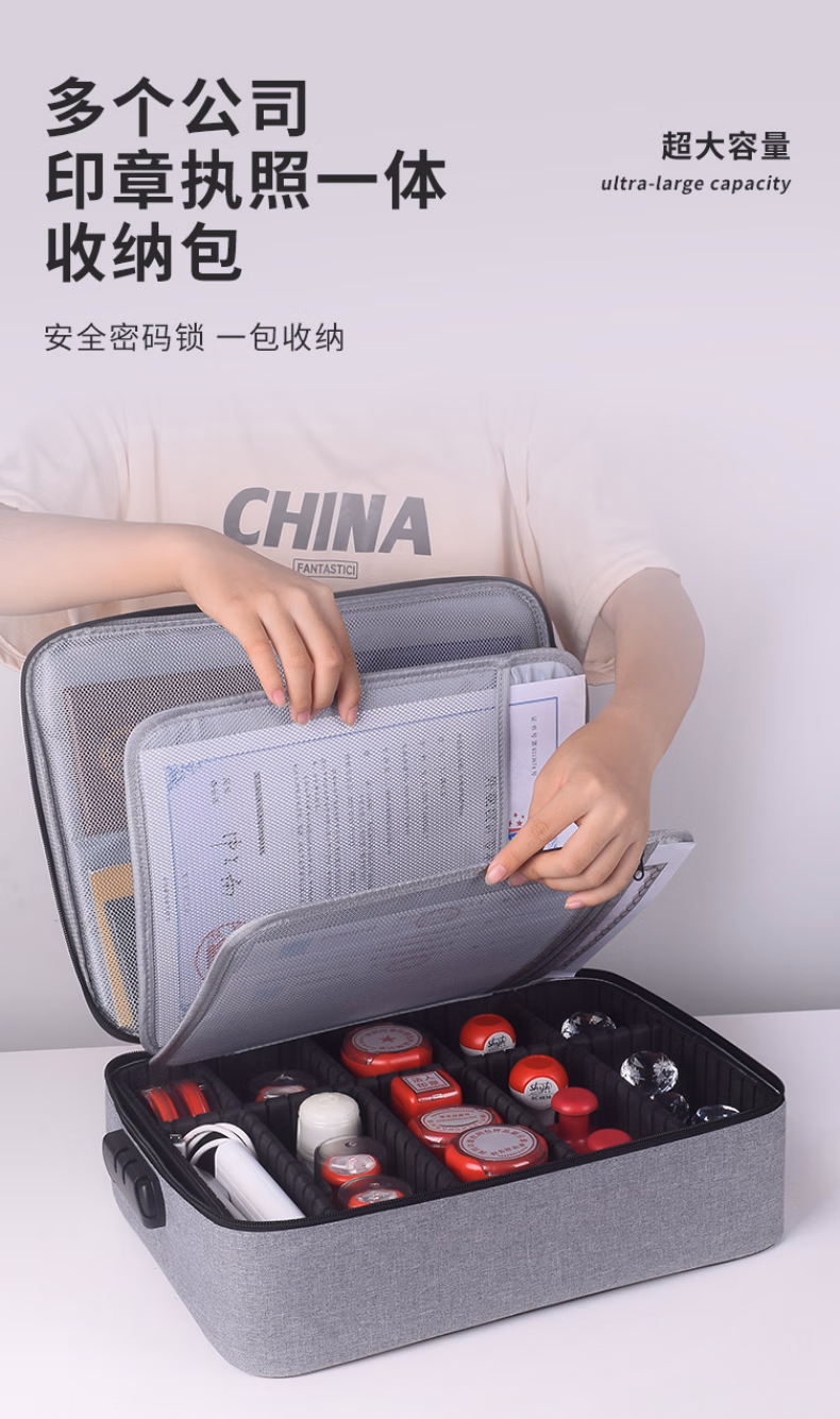 > 立信 印章收纳盒多格印章箱大容量带密码锁营业执照印章收纳包便携印章执照一体包高档公章盒收纳袋 黑色加高(硬壳配A3透明片7个)24个章位
