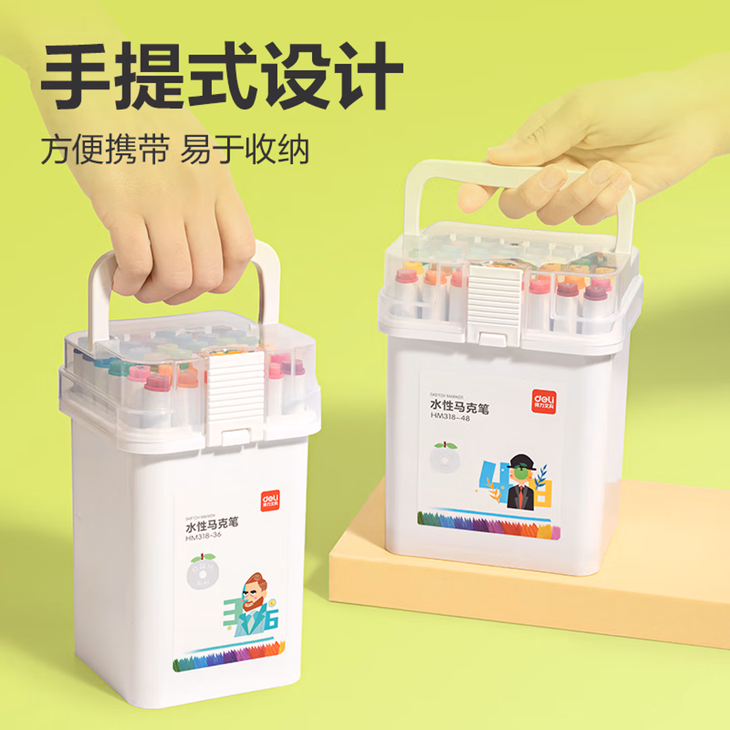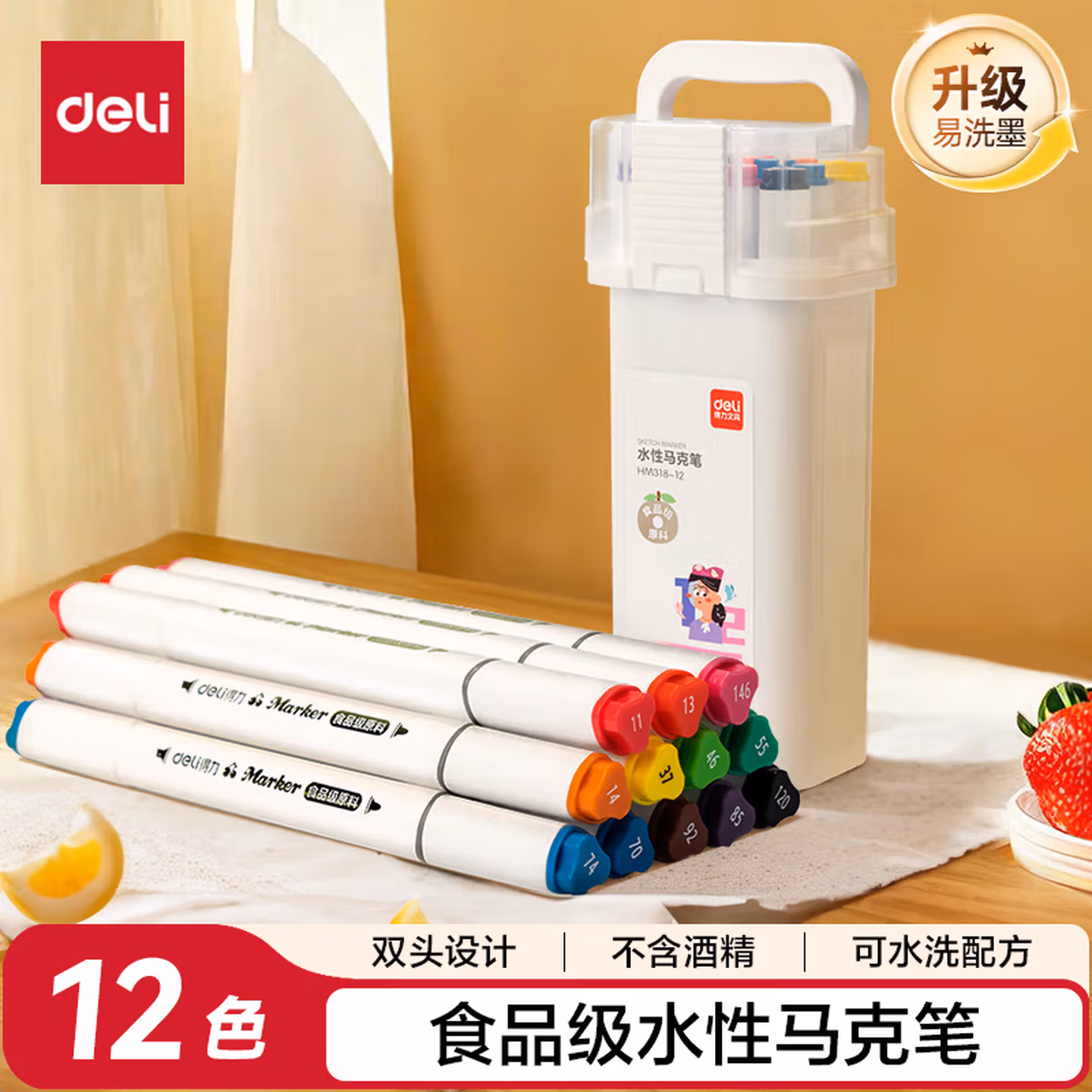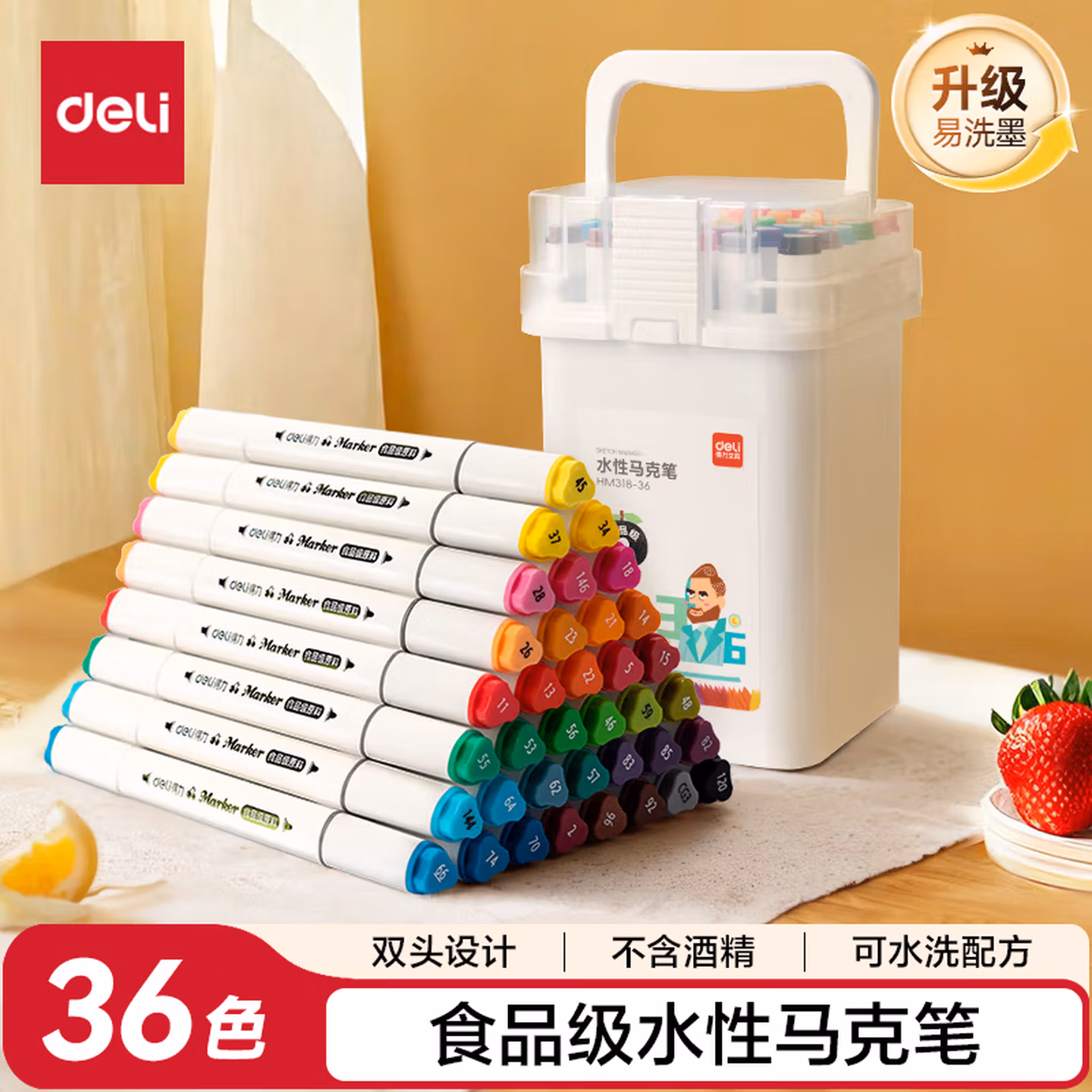> 得力(deli)48色食品级马克笔 儿童粗三角杆双头水性彩笔 学生美术专用绘画画笔套装荧光笔记号笔HM107-48