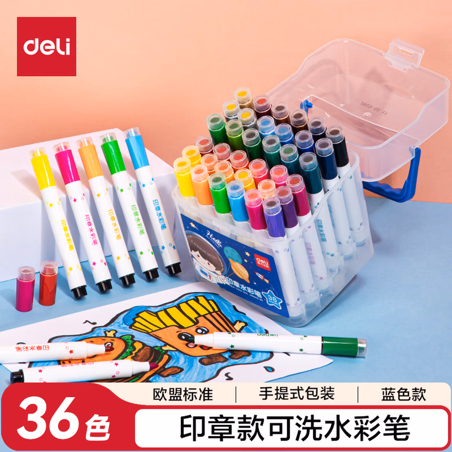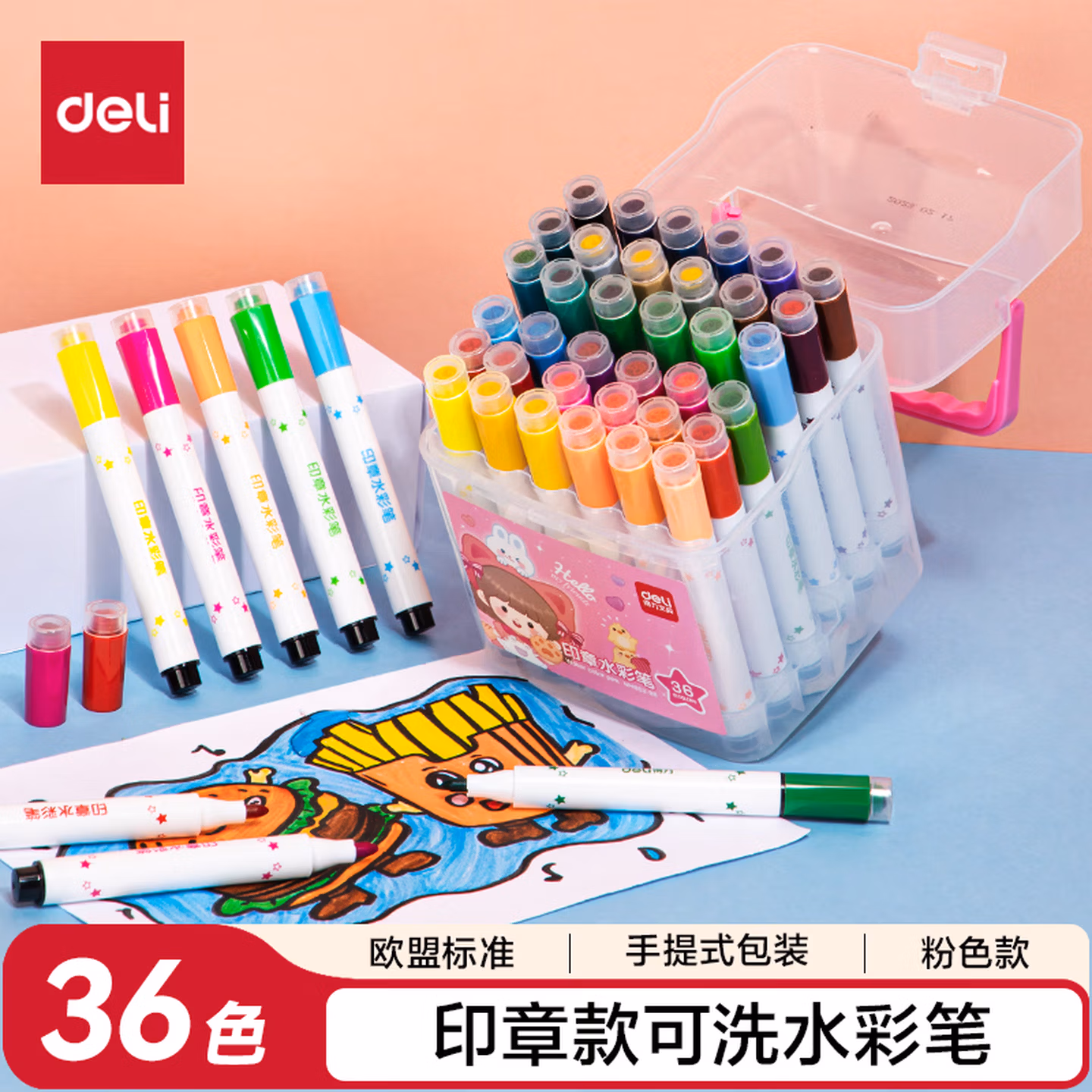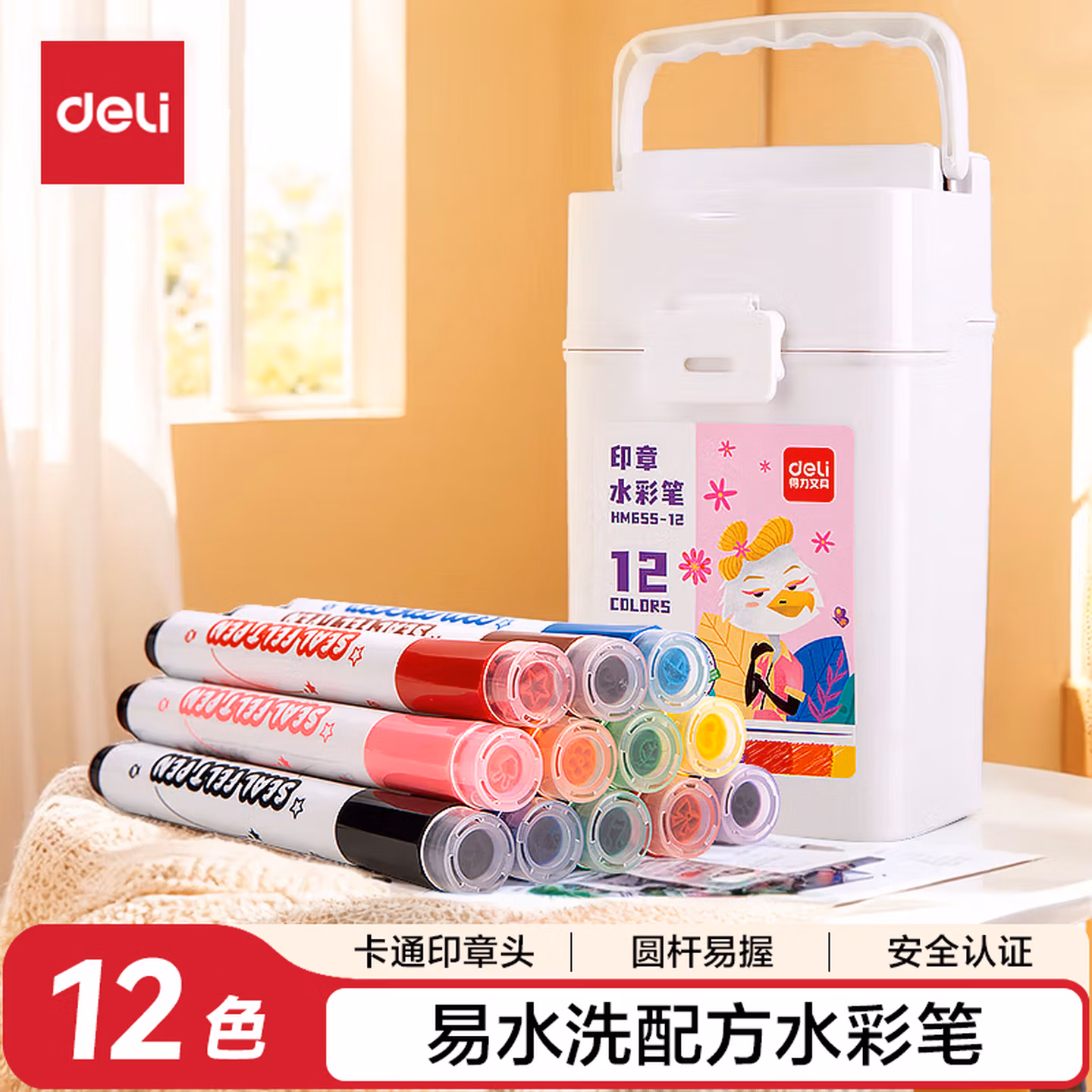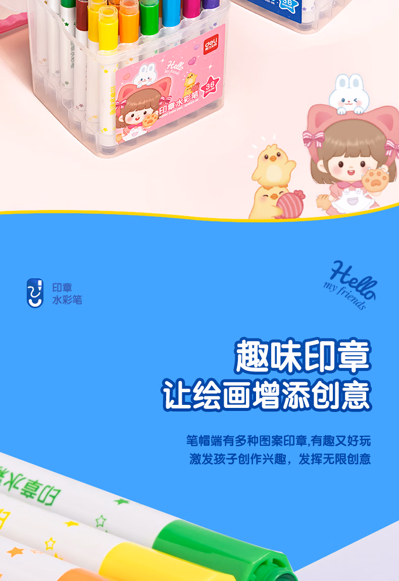 得力(deli)24色圆杆印章水彩笔易可洗臻好洗学生幼儿儿童绘画涂色文具美术画材HM655-24【学生开学】