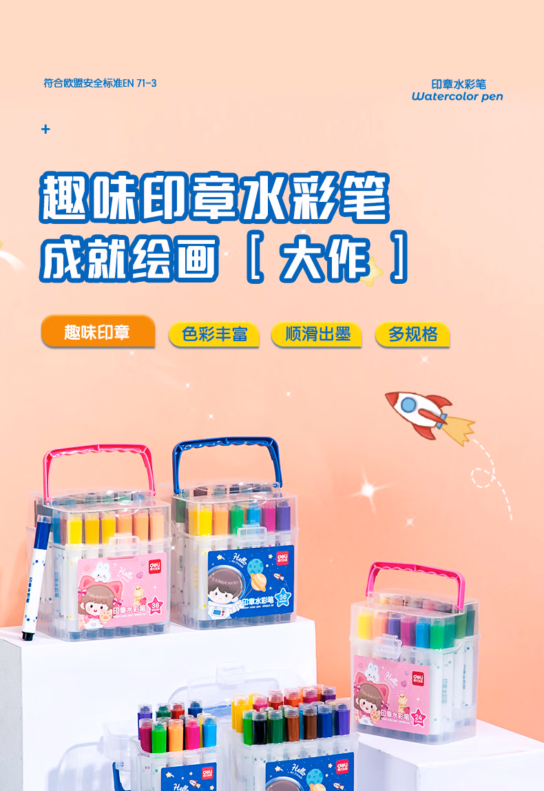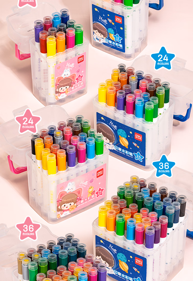 > 得力(deli)24色圆杆印章水彩笔易可洗臻好洗学生幼儿儿童绘画涂色文具美术画材HM655-24【学生开学】