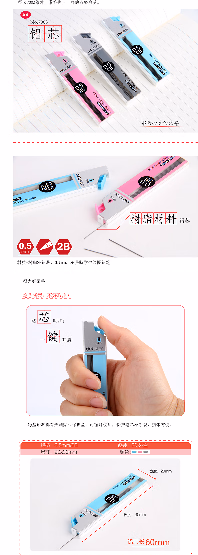 > 得力(deli) 不易断芯 活动铅笔铅芯 0.5mm/0.7mm 铅芯 0.5mm 【0.7mm HB】SH235(100根)