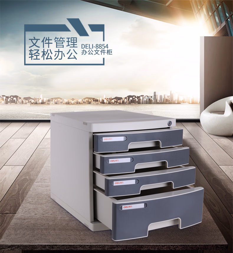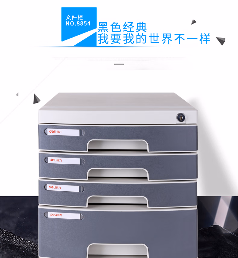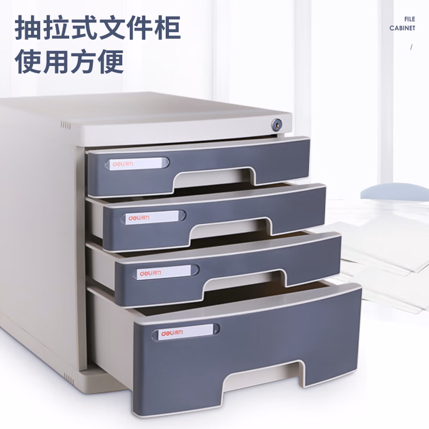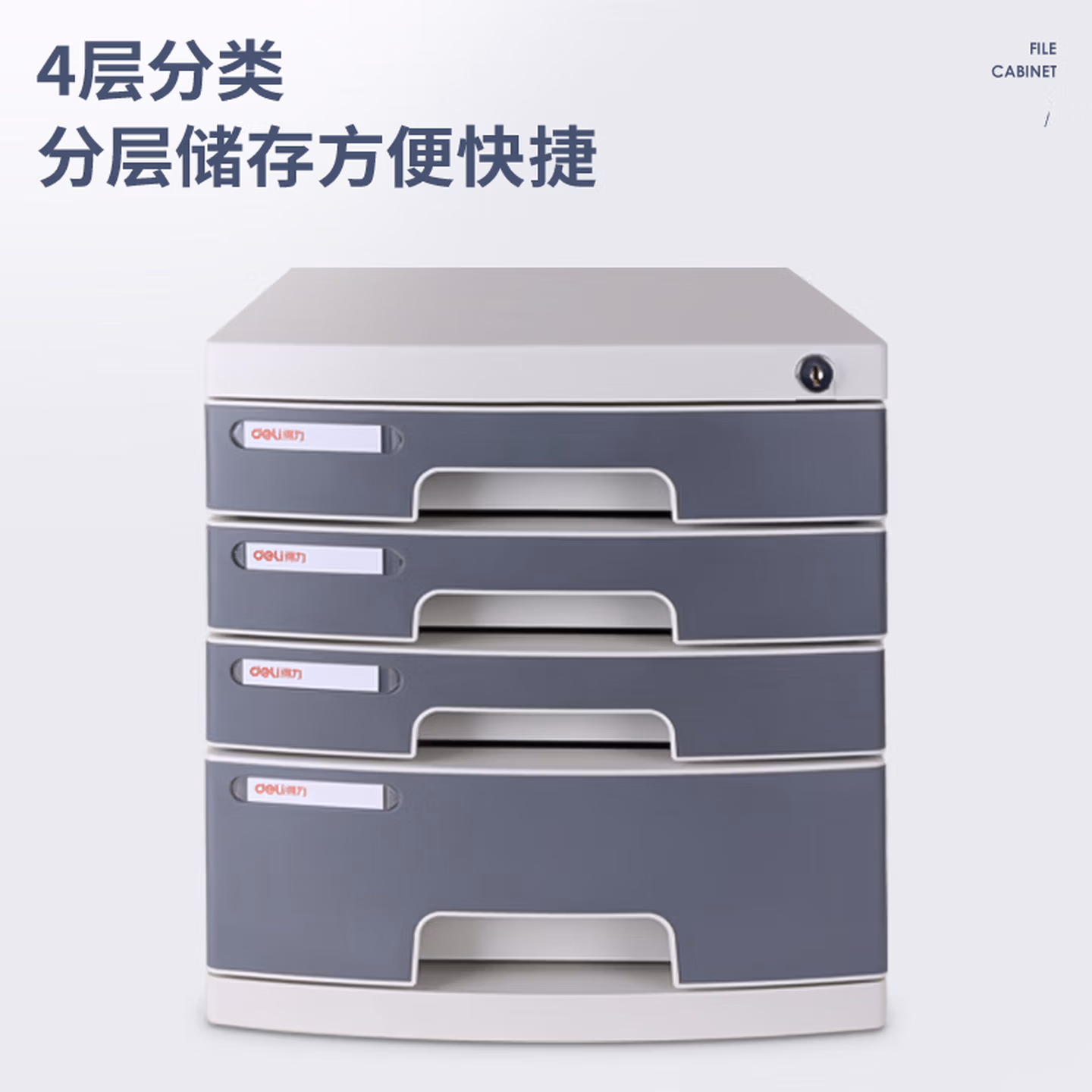 > 得力4层带锁手拉办公桌书桌桌面收纳盒文件柜抽屉式收纳储物资料柜带索引标签试卷学科分类灰色
