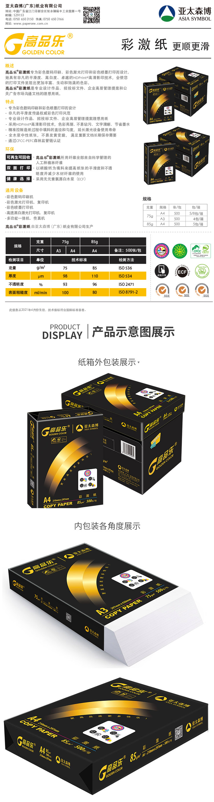 > 亚太森博 高品乐彩激纸复印纸 A4 85g 5包/箱 500张/包M