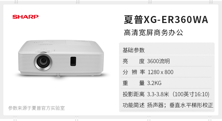 > 夏普(SHARP)XG-ER360WA 办公投影机 高清投影仪(高清 3600流明 1.2倍变焦 宽屏)