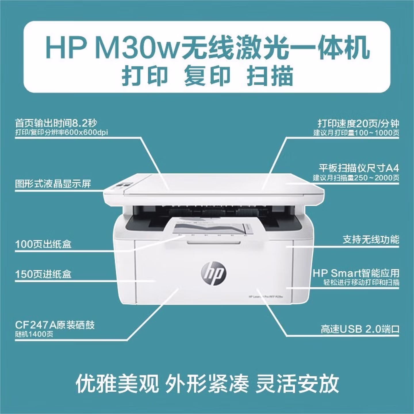 > 惠普(HP)30w 232dwc 136升级1188无线黑白激光打印机家用办公复印扫描多功能一体机 Mini M30w 官配(三合一+无线)玲珑小巧