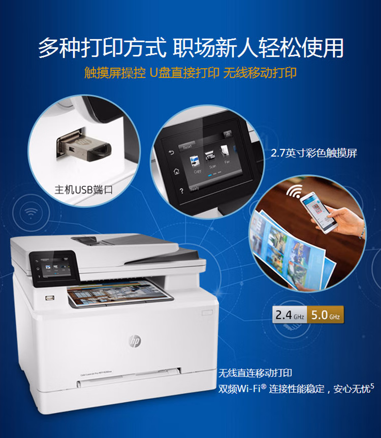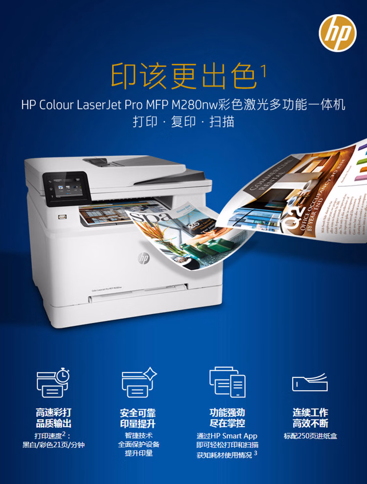 > 惠普(HP)M280nw彩色激光多功能一体机 无线打印复印扫描 支持有线 快速打印商用办公