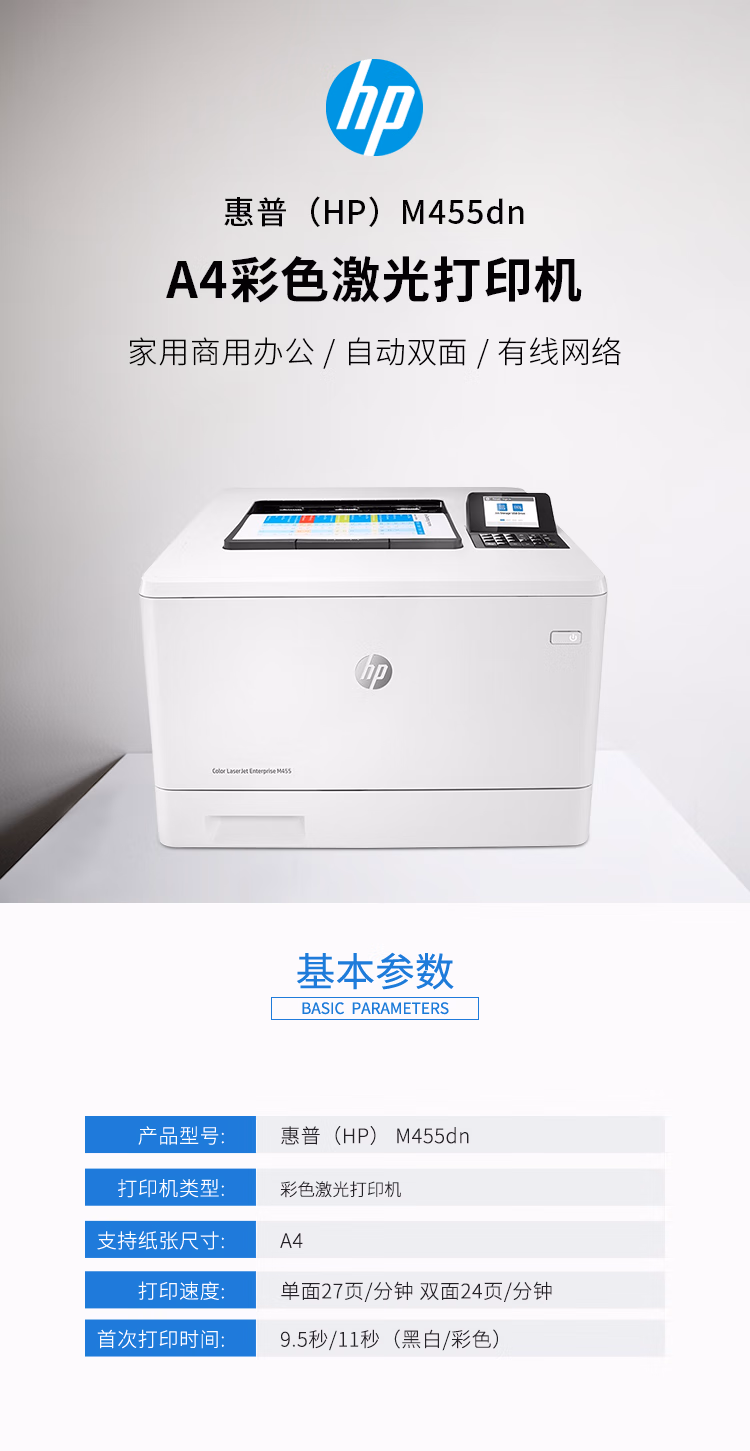 惠普(HP)M427dw/455dn彩色激光打印机 自动双面高速打印 有线网络 企业级 M455dn|双面|有线企业文印