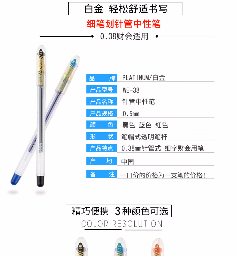 > 白金(PLATINUM)WE-38针管型中性笔0.38mm财会记帐水笔细笔划学生用考试刷题笔办公用签字笔黑蓝红色顺滑全针管头 黑色笔【5支】