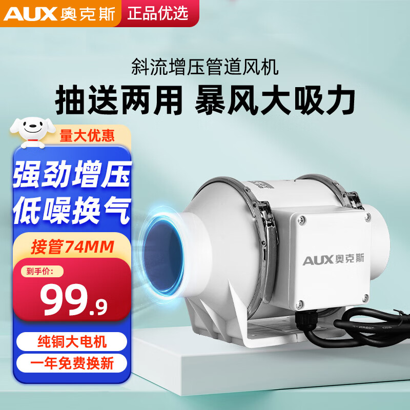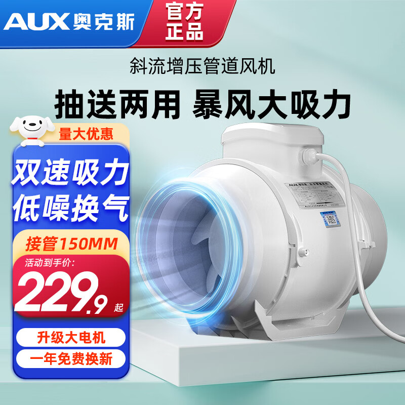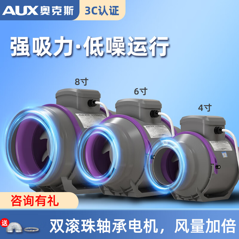 奥克斯(AUX)换气扇管道风机斜流增压家用油烟机强吸力静音排风扇抽风机排气扇 【风量210m3/h】单速管接100mm