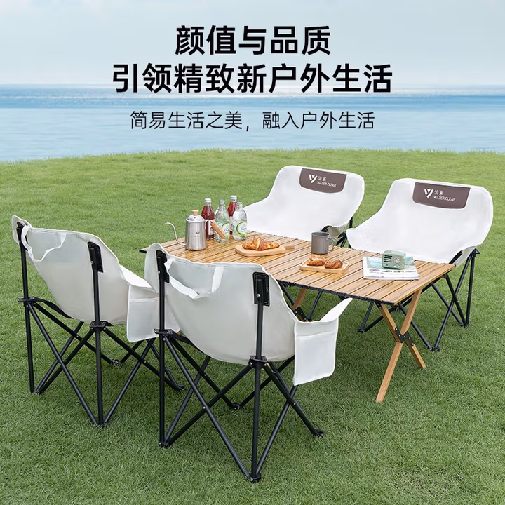 > 清系折叠椅户外露营便携靠背钓鱼椅懒人椅家庭休闲月亮椅旅游旅行椅 聚会出游-大号蛋卷桌+月亮椅青*6