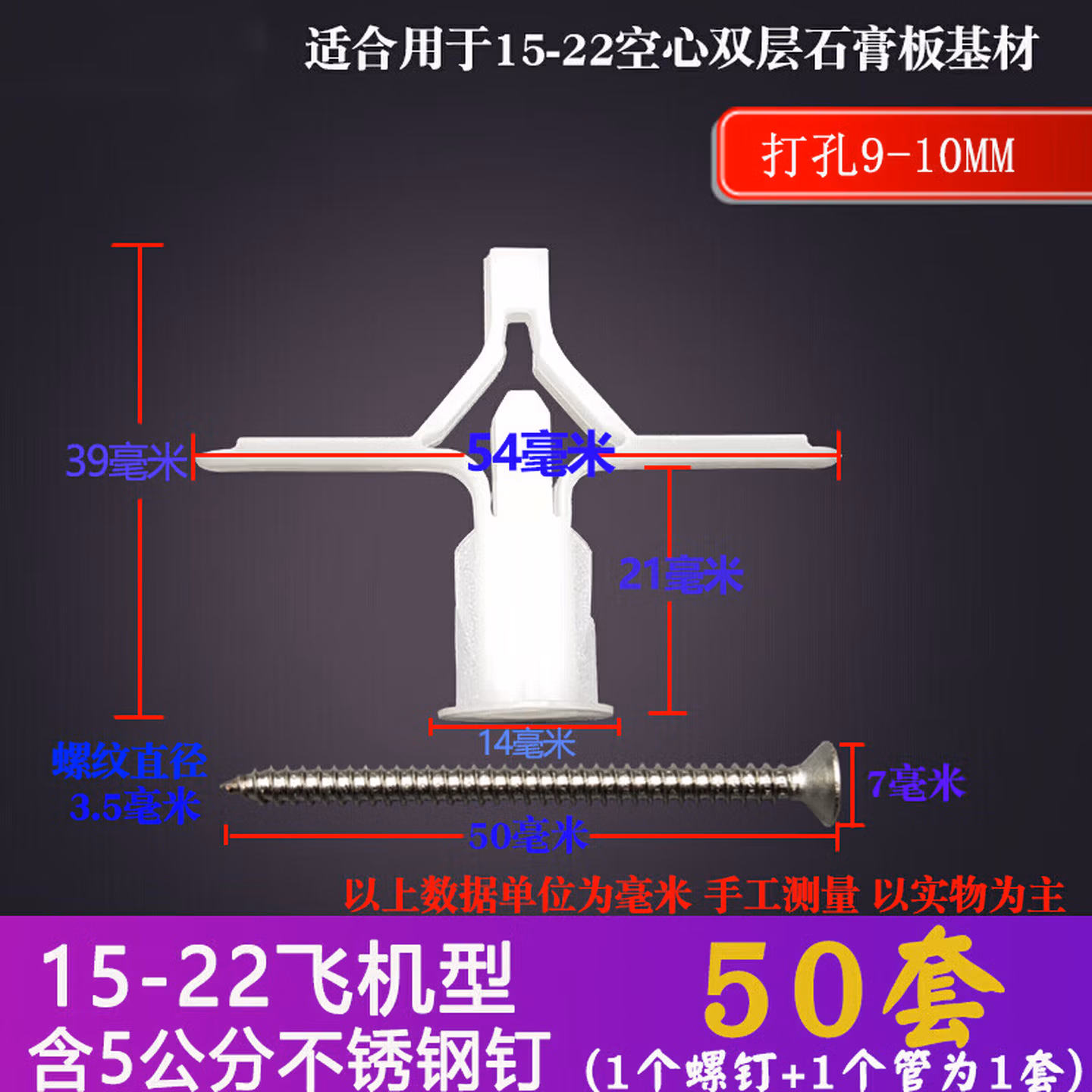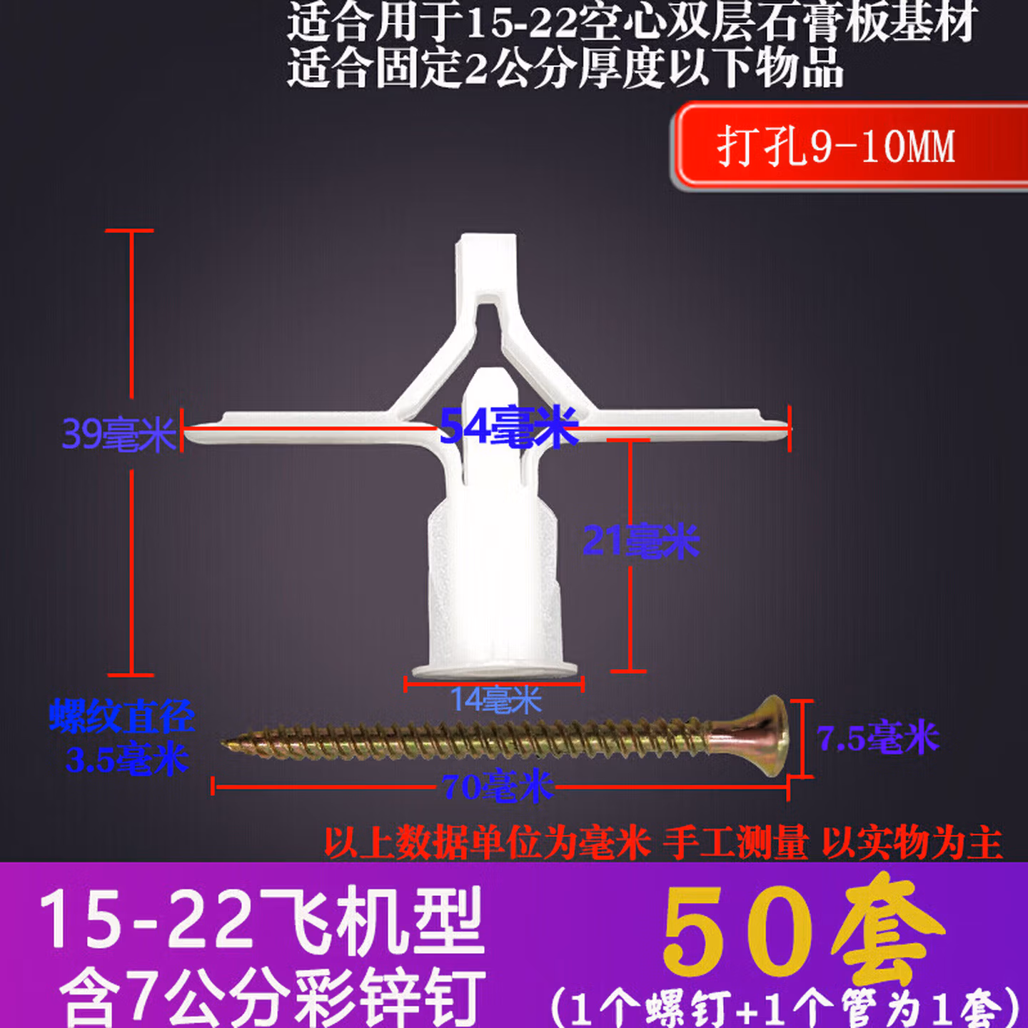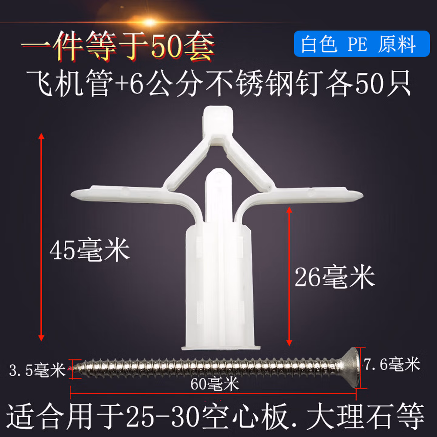溥畔蝴蝶石膏板空心砖膨胀螺丝飞机管窗帘中空壁虎中控膨胀螺丝钉螺栓 25-30飞机管+7公分碳钢螺丝50套
