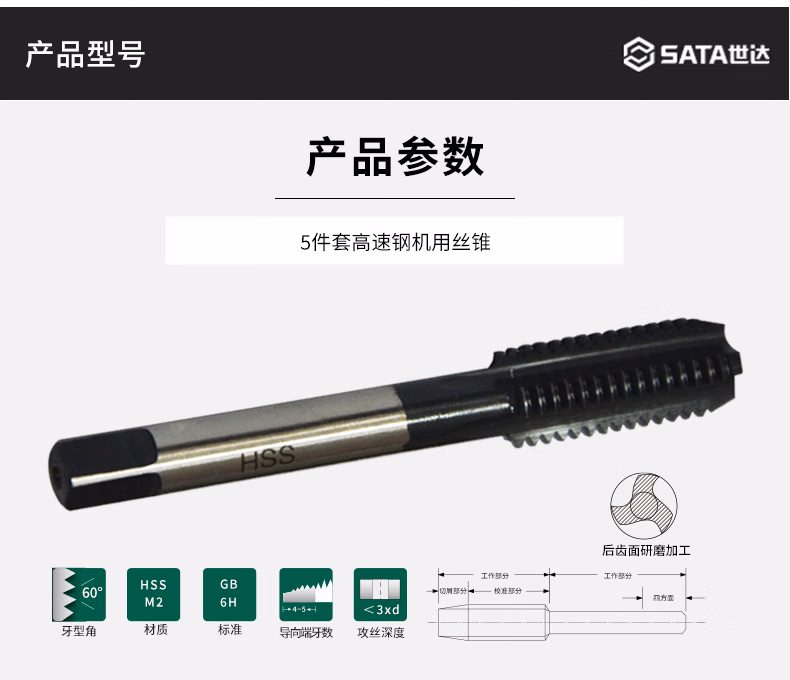 世达(SATA) 5件套高速钢粗牙机用丝锥M3x0.5mm 50603 现货