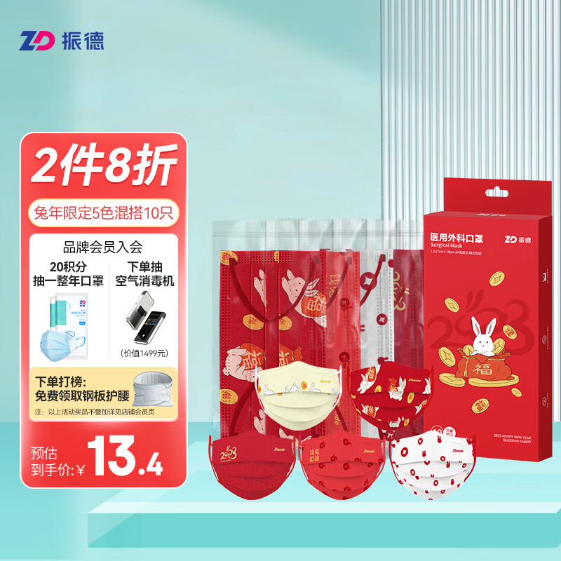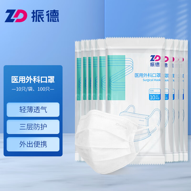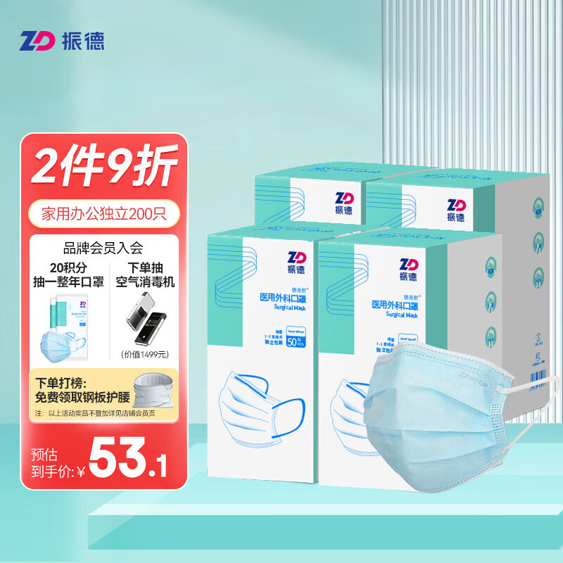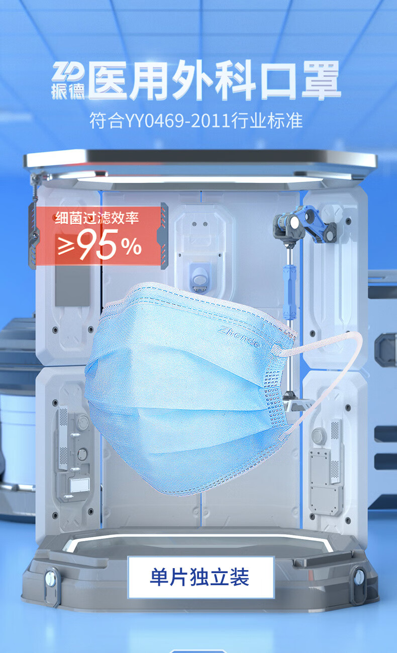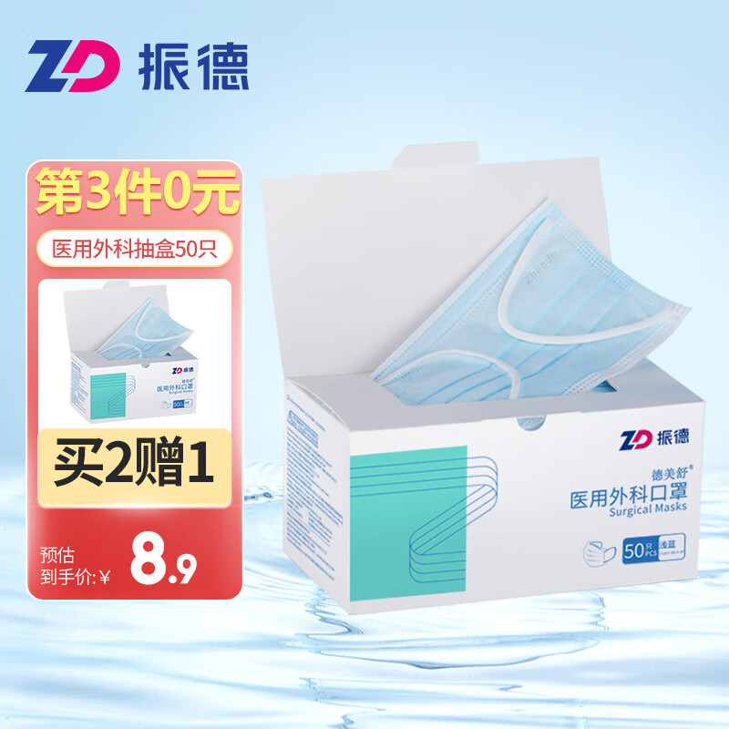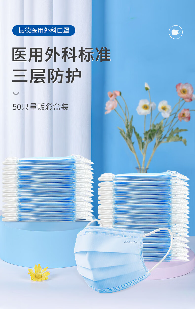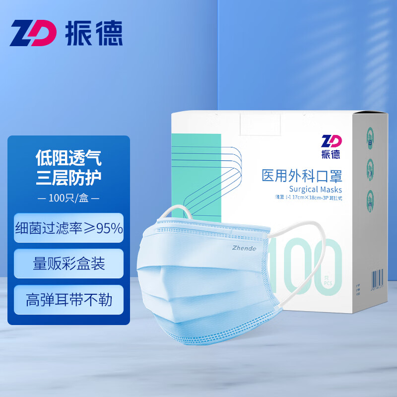 > 振德(ZHENDE)一次性医用外科口罩 非灭菌独立纯色浅蓝50只/盒 防沙尘暴防飞沫沙尘防花粉(二类医疗器械)