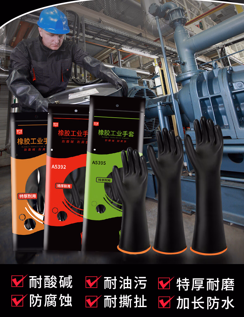 > 安美尚 (ams) 工业耐酸碱橡胶手套 10双/包 加长加厚防油防化耐腐蚀防护加厚双层胶 A539