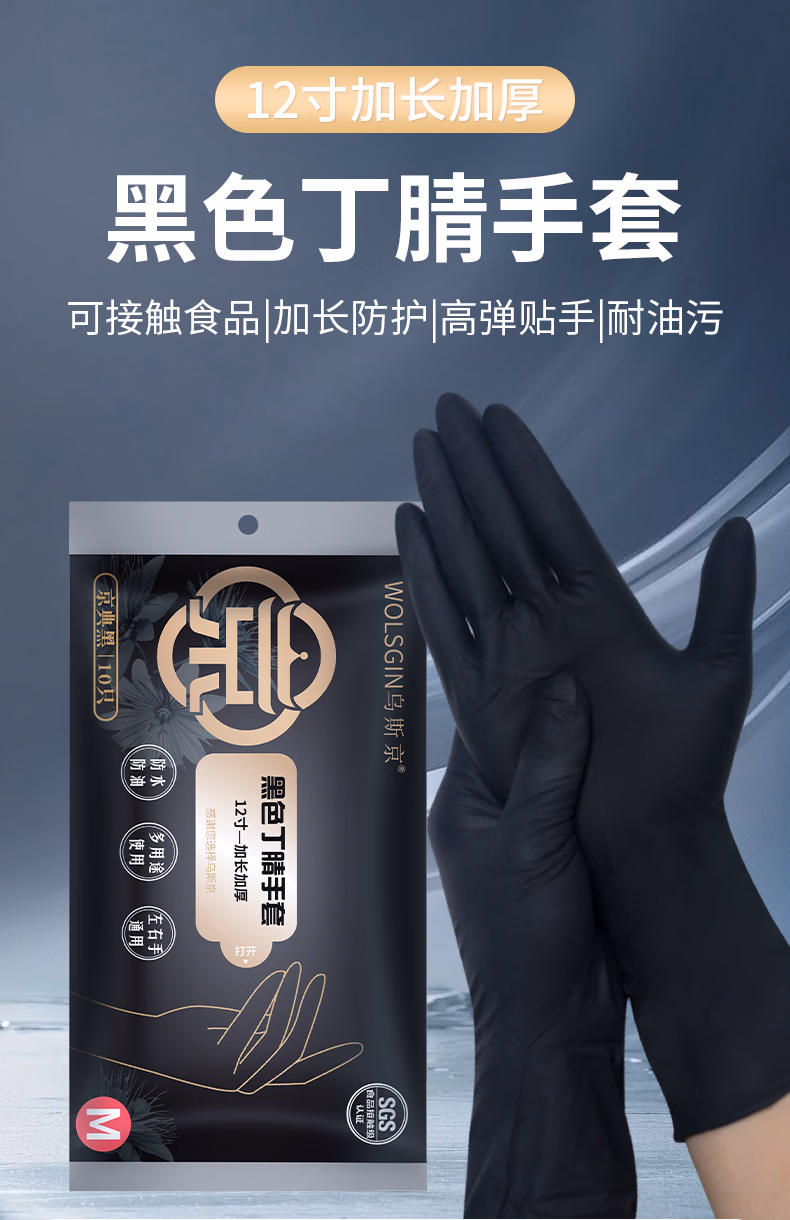 乌斯京(WOLSGIN)一次性手套丁腈加长30只大码食品级丁晴手套厨房洗碗防水12英寸