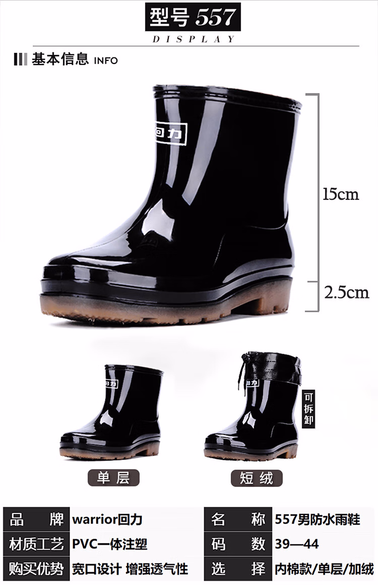 > 回力雨鞋男士冬季中筒防水胶鞋加绒可拆卸保暖水鞋雨靴套鞋6557黑 40