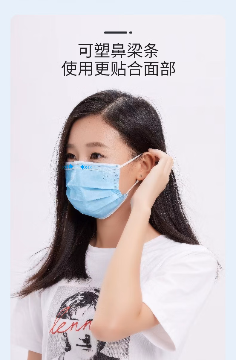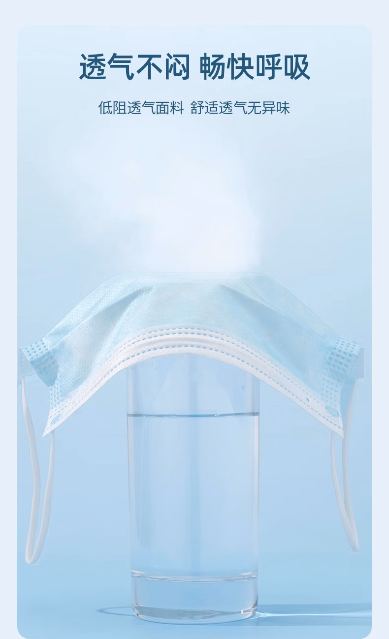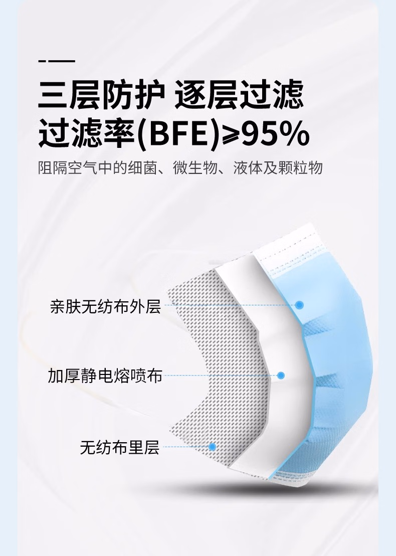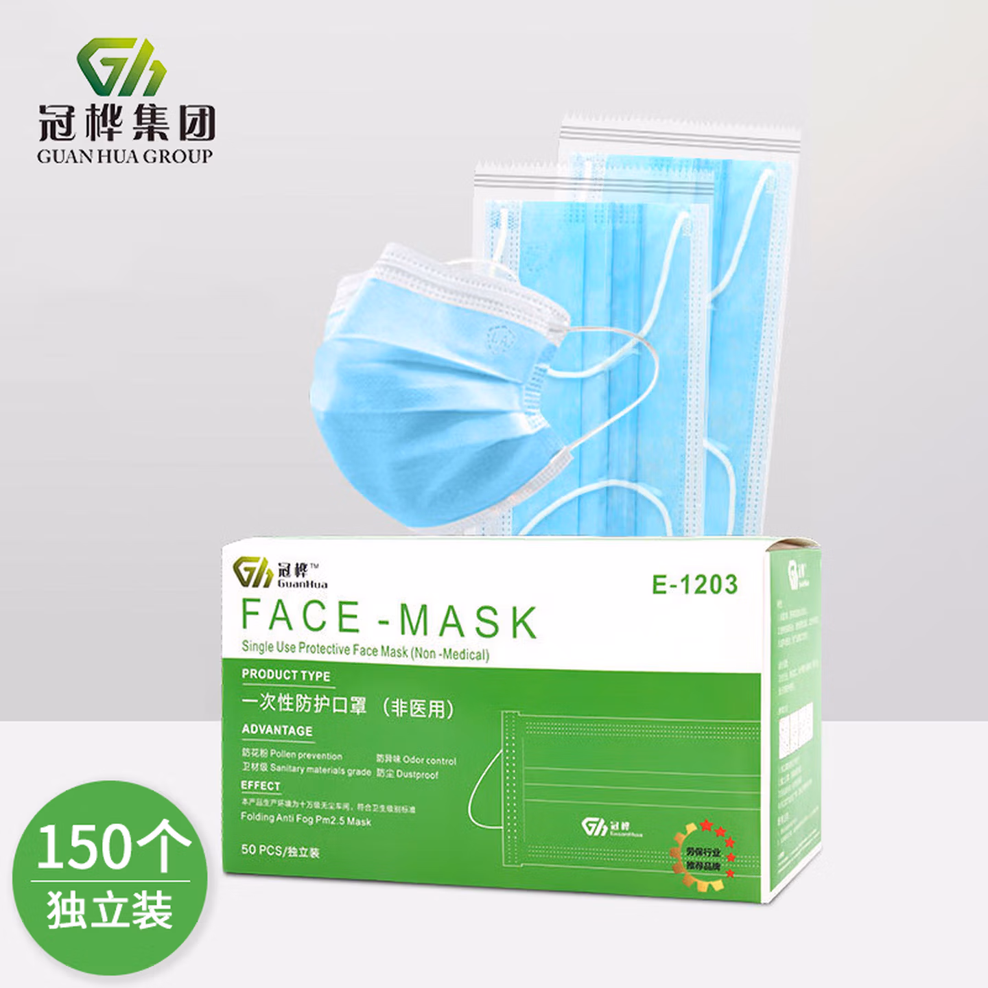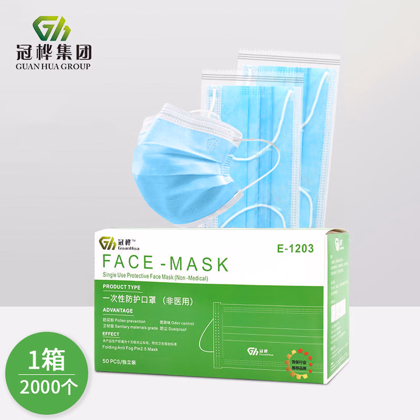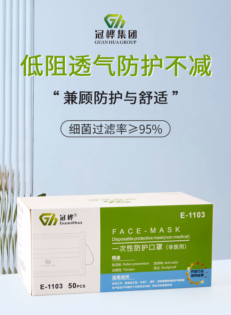 > 冠桦 E1103 一次性防护口罩1盒50只 蓝色 舒适透气三层防护过滤效率大于95%成人防护口罩