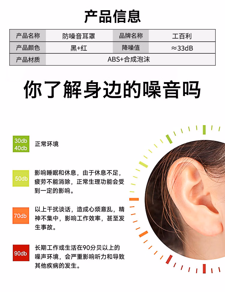 > 工百利隔音耳罩工业防噪音耳塞静音耳机射击 33dB降噪效率