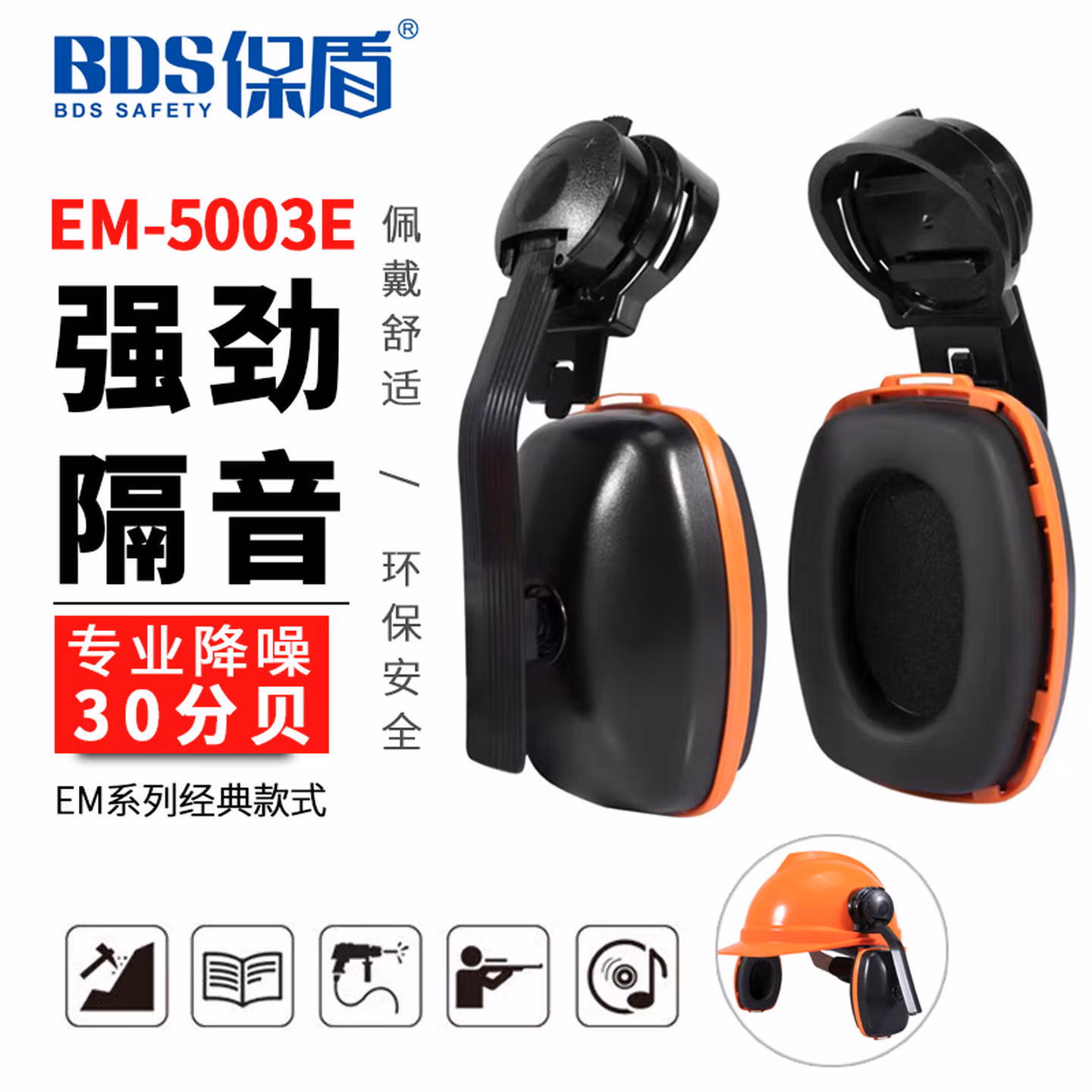 保盾隔音耳罩工业级超强降噪睡眠头戴式耳机睡觉防噪音工地施工打磨 保盾EM-5003E橙色安全帽式(30分贝)