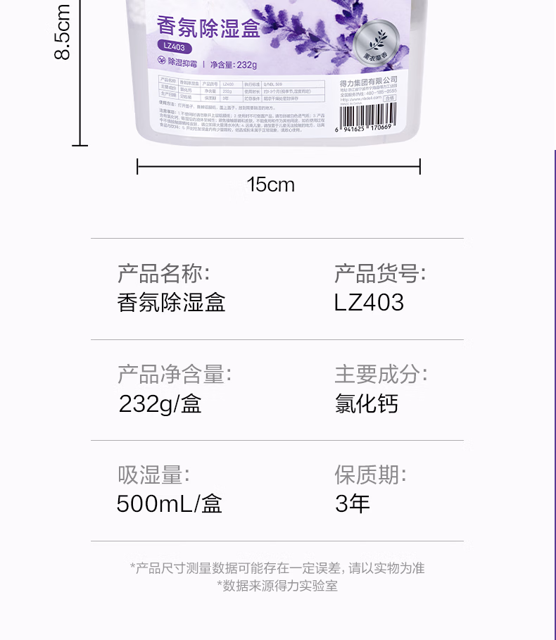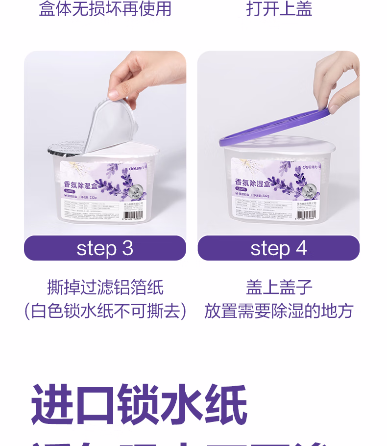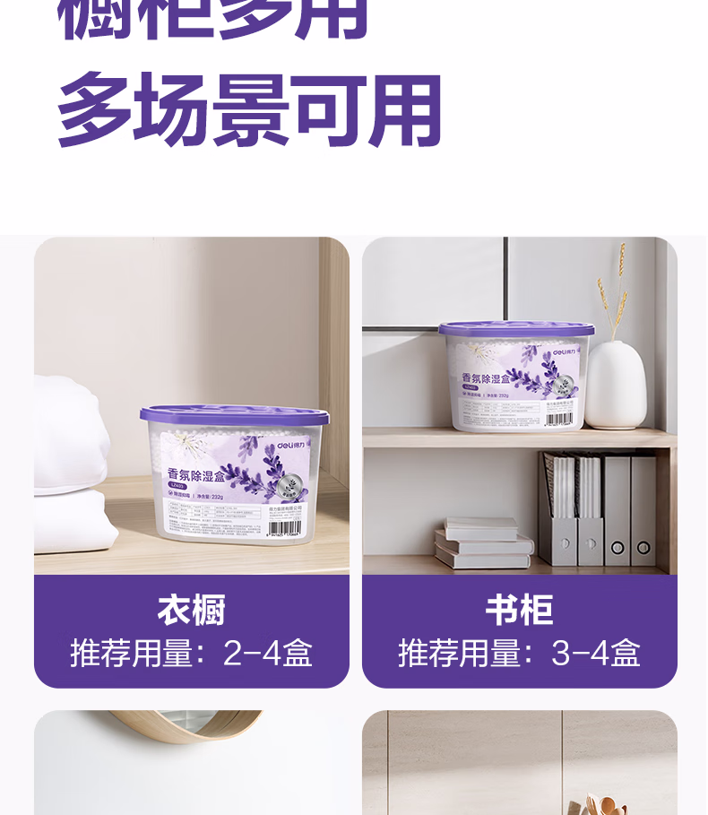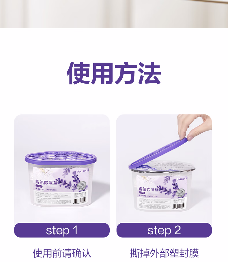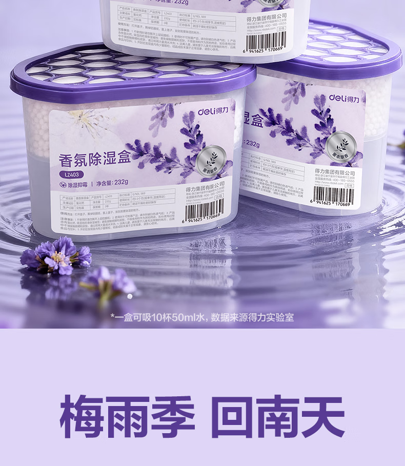 > 得力(deli)薰衣草除湿盒干燥剂室内衣柜衣服除湿剂防潮除霉剂珠吸湿500ml*3盒 LZ403