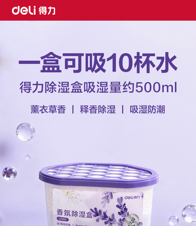 得力(deli)薰衣草除湿盒干燥剂室内衣柜衣服除湿剂防潮除霉剂珠吸湿500ml*3盒 LZ403