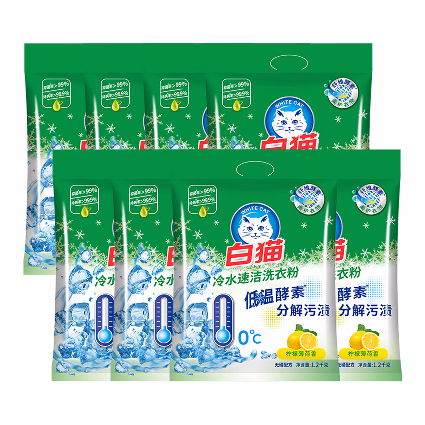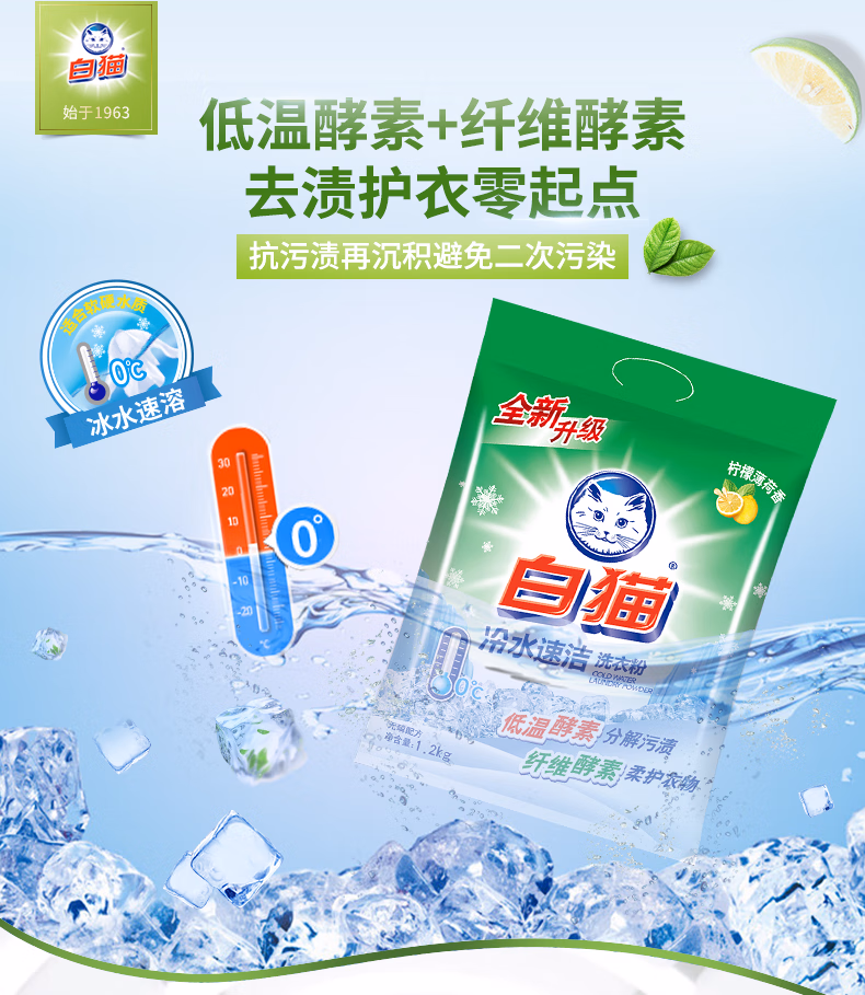 白猫冷水速洁洗衣粉2.4斤*8袋(整袋装)双酵合一去渍护衣 低泡易漂
