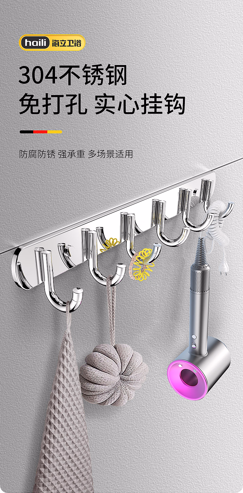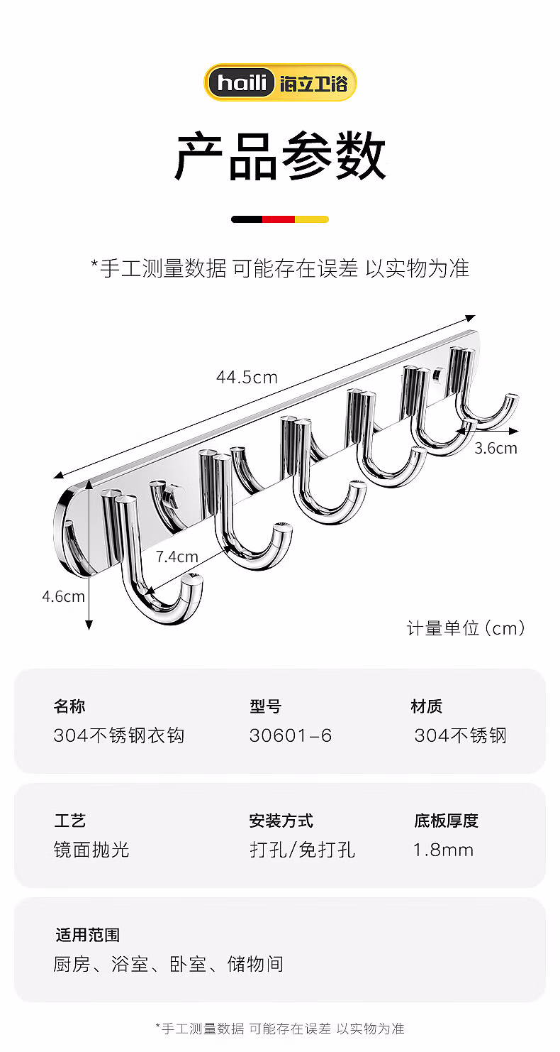 海立304不锈钢免打孔厨房墙壁挂钩连排粘钩浴室卫生间衣服帽钩30601-6